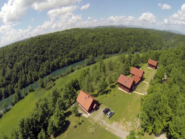 Complet echipate și moderne, case de vacanta in natura neatinsa pe raul Mrežnica. Inchirieri trei case din lemn. Fiecare este de 140 m2. La etaj sunt trei dormitoare la parter living, bucatarie si terasa. După o baie pe etaj si parter. Bucataria este complet utilata. Oaspeții pot folosi gratar. În plus față de casa este un loc de joacă pentru fotbal, volei și badminton. In fata o terasa mare este o piscină 10x4 m. Adaptarea promenada de-a lungul râului. Am inchiriat caiace și biciclete de munte. Alimentele pot fi comandate în avans.