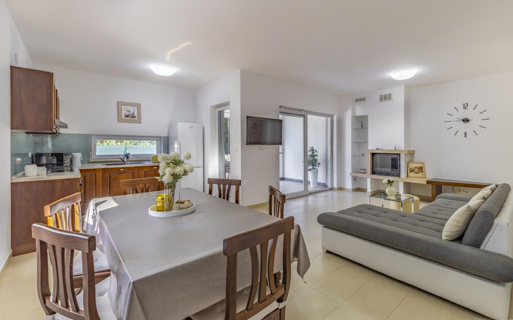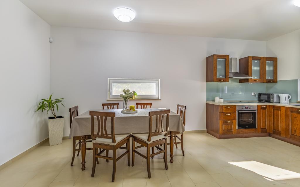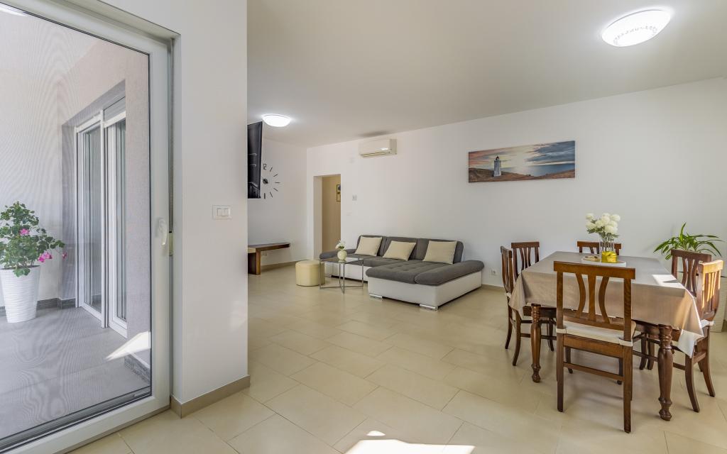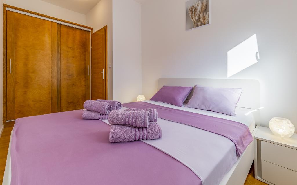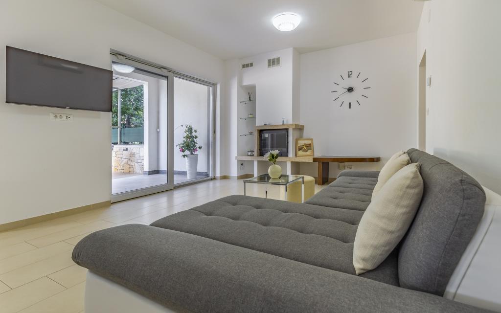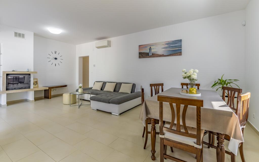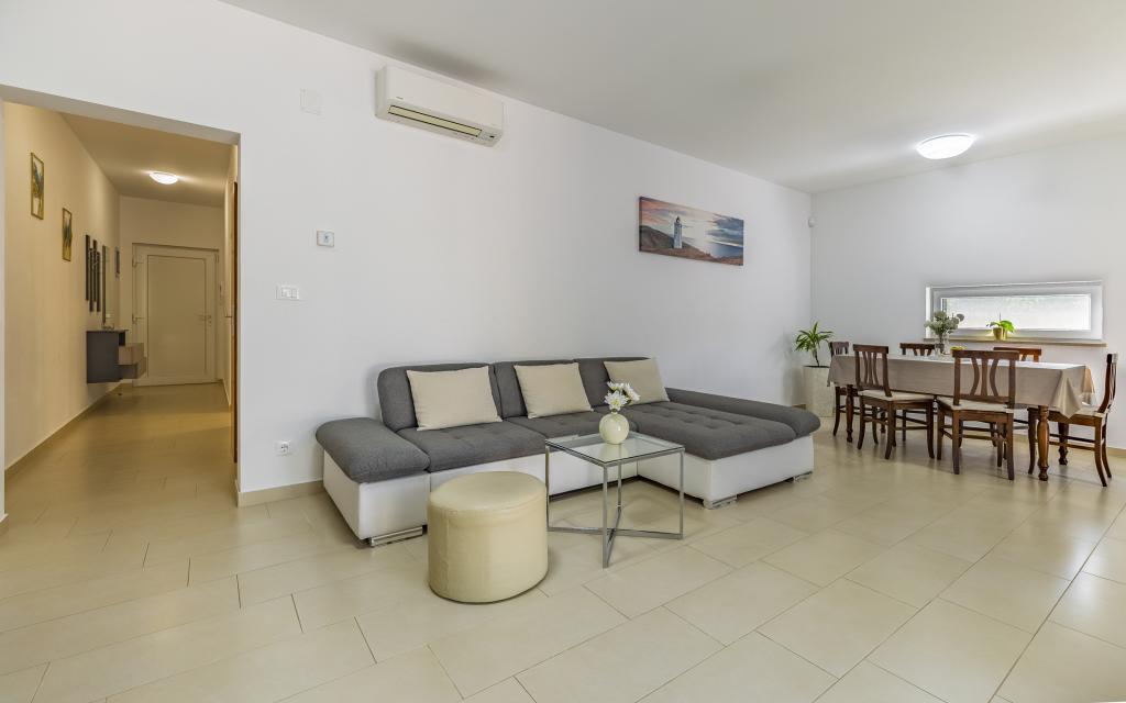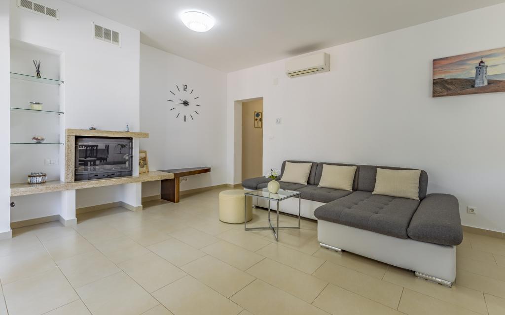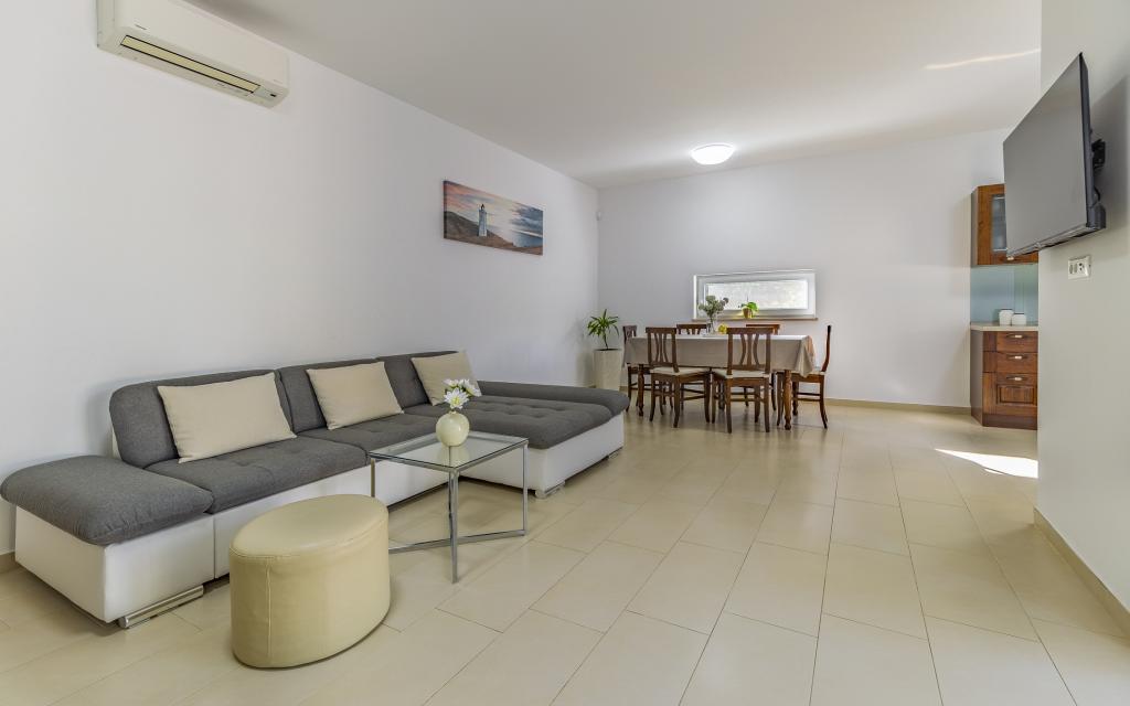 Apartament complet mobilat și la standarde superioare (80 m2), într-o locație excelentă, într-o zonă liniștită din Banjol, la doar 5 minute (300 m) de mers pe jos de cele mai frumoase plaje din zonă. Apartamentul este situat la parterul unei clădiri rezidențiale cu doar trei apartamente. Apartamentul are o grădină privată (100 m2) cu terasă, masă, șezlonguri, duș exterior și grătar, care permite o socializare plăcută cu multă intimitate și este potrivită în special pentru familiile cu copii. Există o parcare privată lângă clădire, cu acces direct la grădină și terasă. Grădina a fost complet renovată în 2024. Întreaga clădire este protejată de un gard de securitate (acces cu card). Apartamentul are 2 dormitoare cu paturi duble, 2 băi cu toaletă și duș, un living spațios cu o canapea extensibilă, sufragerie și bucătărie. Apartamentul este climatizat și încălzit iarna (încălzire prin pardoseală) și are un șemineu interior, așa că este potrivit și pentru ședere în lunile mai reci de toamnă și iarnă. În imediata vecinătate a apartamentului există numeroase baruri și restaurante, precum și magazine decorate.