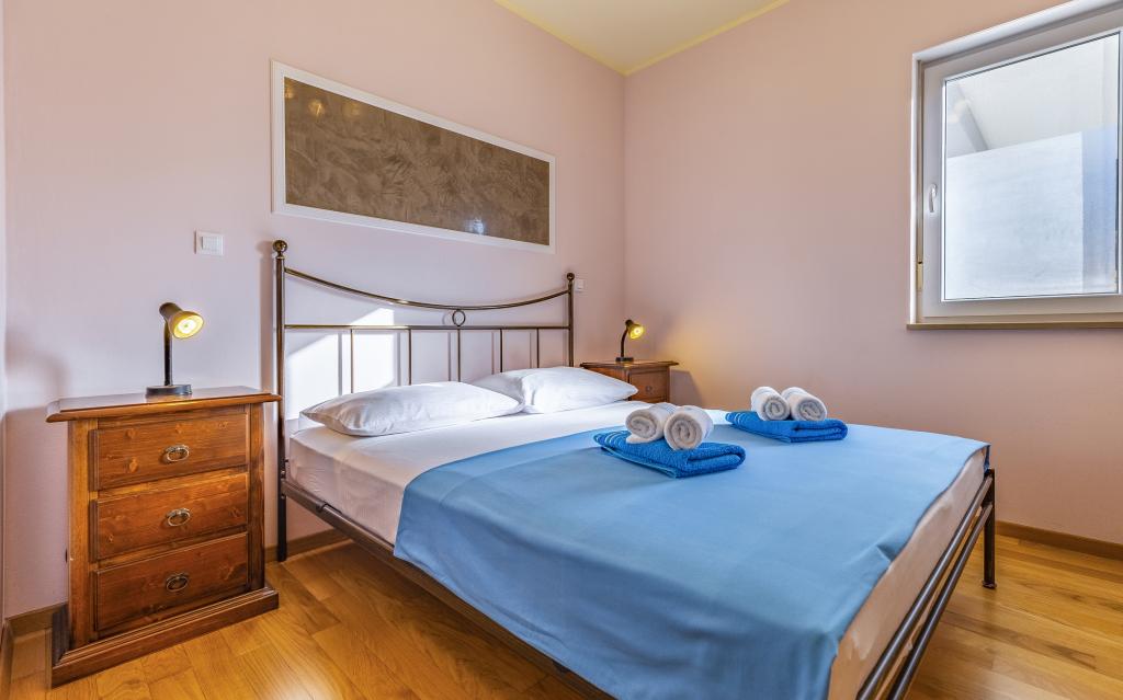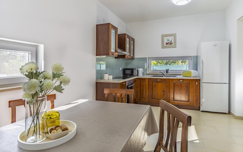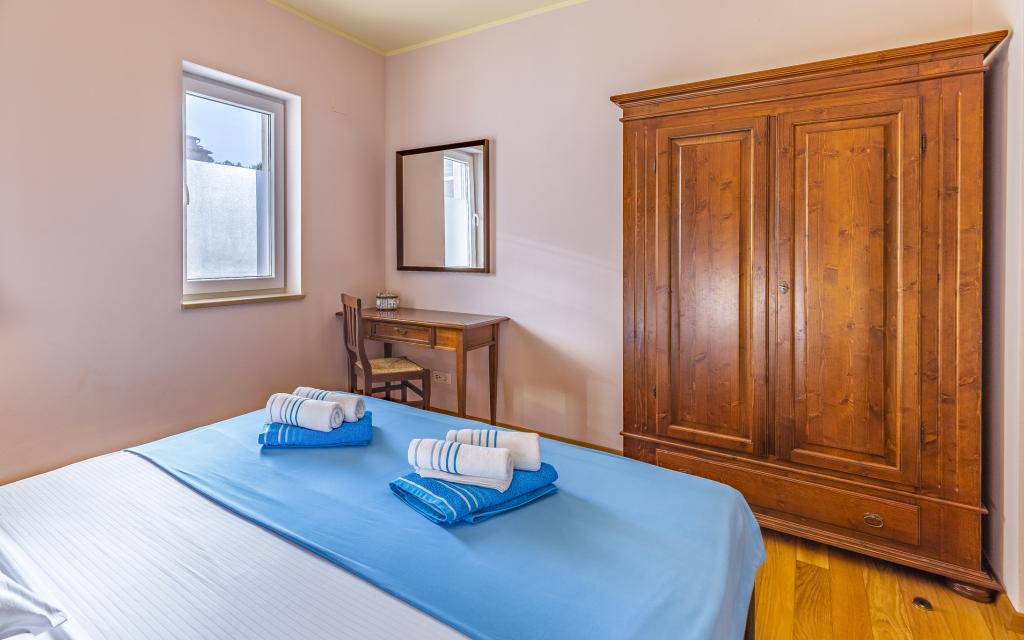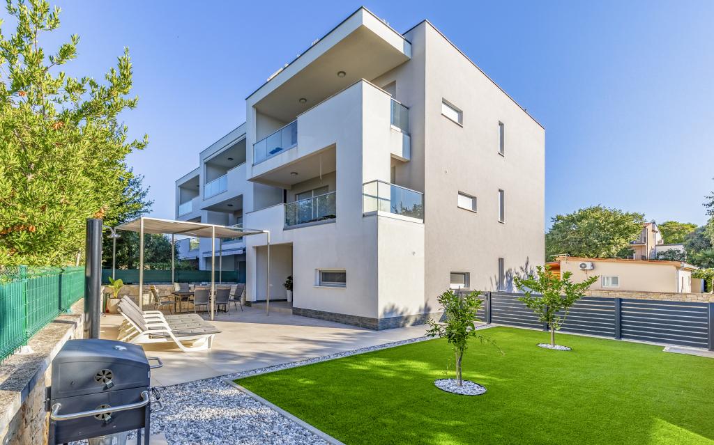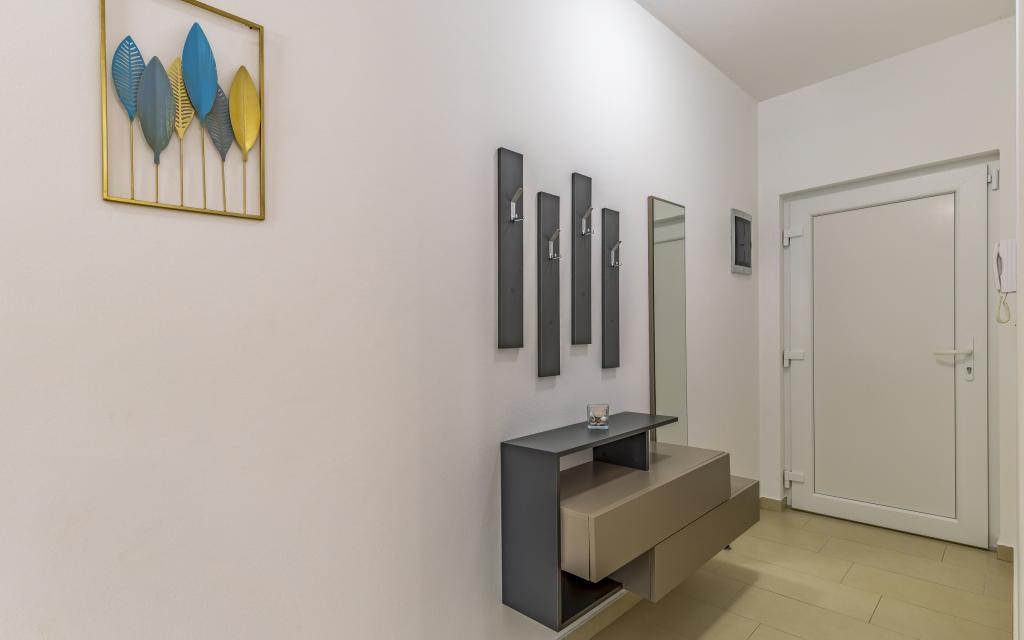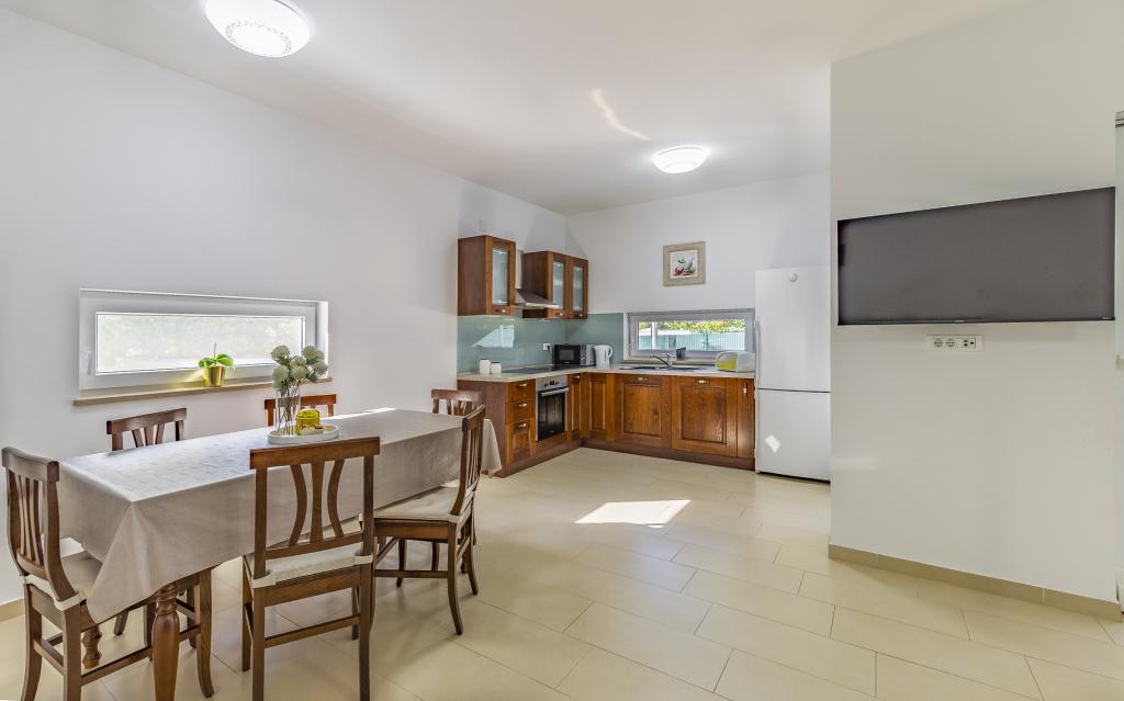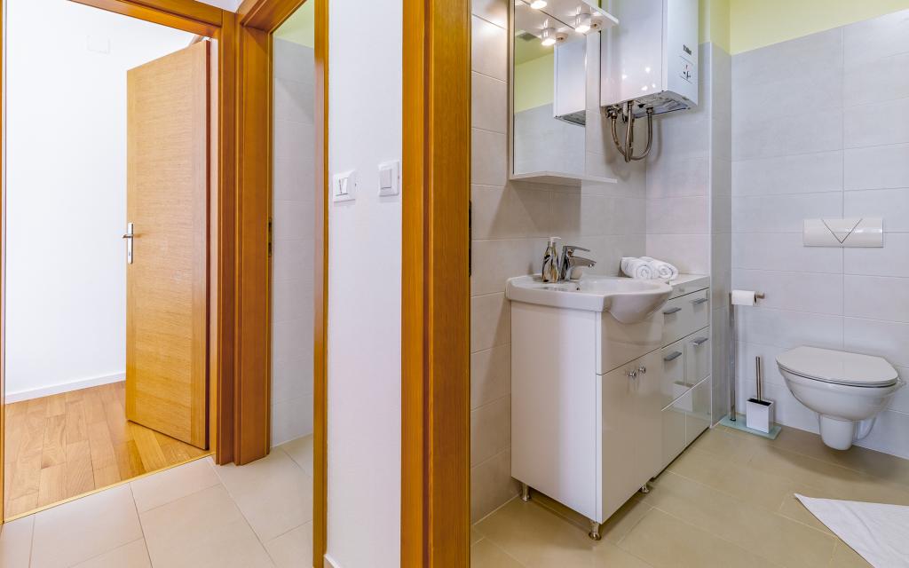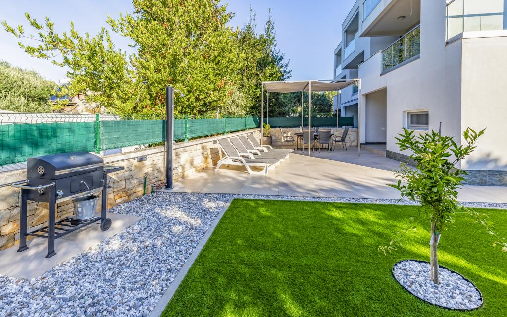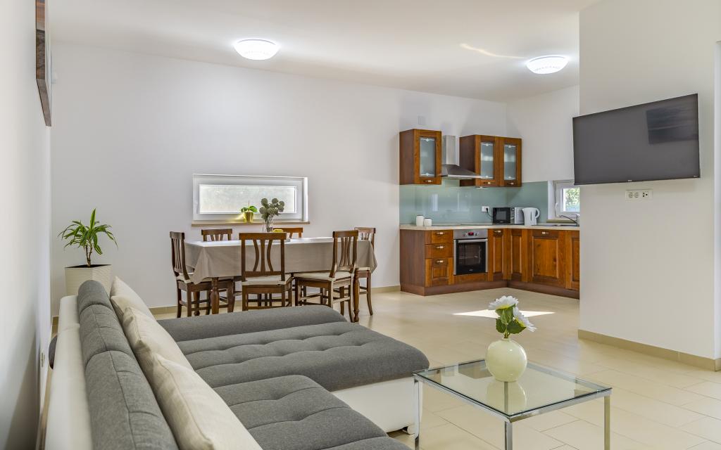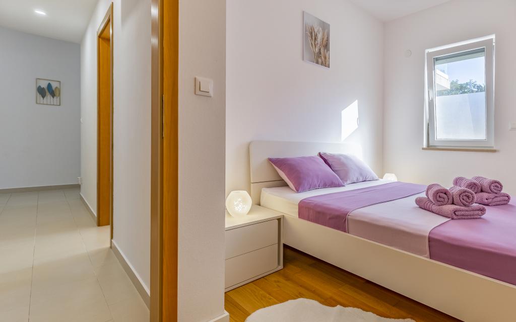 Apartament complet mobilat și la standarde superioare (80 m2), într-o locație excelentă, într-o zonă liniștită din Banjol, la doar 5 minute (300 m) de mers pe jos de cele mai frumoase plaje din zonă. Apartamentul este situat la parterul unei clădiri rezidențiale cu doar trei apartamente. Apartamentul are o grădină privată (100 m2) cu terasă, masă, șezlonguri, duș exterior și grătar, care permite o socializare plăcută cu multă intimitate și este potrivită în special pentru familiile cu copii. Există o parcare privată lângă clădire, cu acces direct la grădină și terasă. Grădina a fost complet renovată în 2024. Întreaga clădire este protejată de un gard de securitate (acces cu card). Apartamentul are 2 dormitoare cu paturi duble, 2 băi cu toaletă și duș, un living spațios cu o canapea extensibilă, sufragerie și bucătărie. Apartamentul este climatizat și încălzit iarna (încălzire prin pardoseală) și are un șemineu interior, așa că este potrivit și pentru ședere în lunile mai reci de toamnă și iarnă. În imediata vecinătate a apartamentului există numeroase baruri și restaurante, precum și magazine decorate.