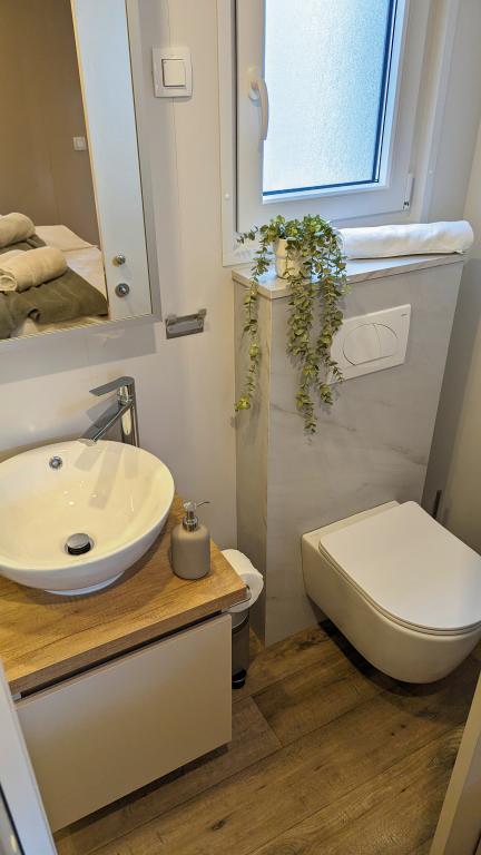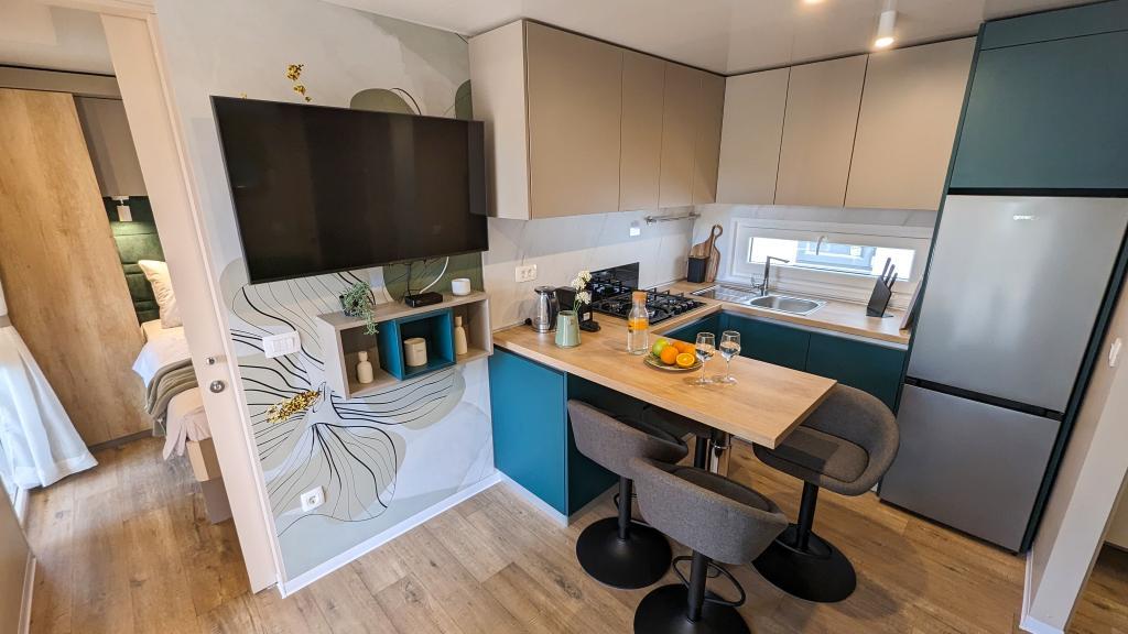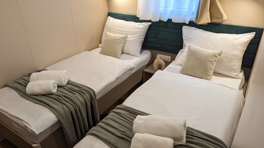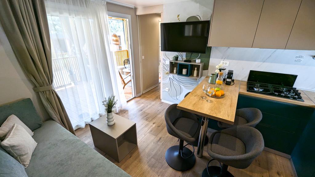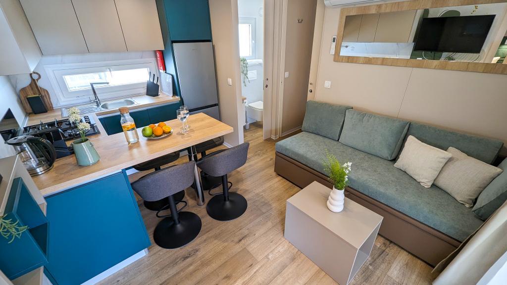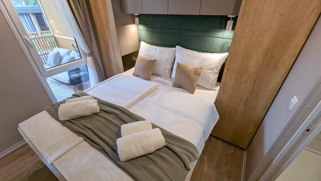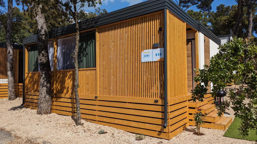 Bucurați-vă de natură și confort: rulotele Jaki de la Campingul Soline, Biograd na Moru. Situate într-o zonă liniștită a campingului de 4 stele, înconjurate de păduri de pini, rulotele noastre modern echipate sunt ideale pentru până la 6 persoane. Bucurați-vă de apropierea de plajă (2-5 minute de mers pe jos), magazine și restaurante, precum și de promenada care duce spre centrul orașului (15 minute). Aceste rulote oferă 2 dormitoare și 2 băi, un living, o terasă mare cu masă și zonă de lounge și o bucătărie complet utilată - mașină de spălat vase, cuptor cu microunde, aparat de cafea, prăjitor de pâine, blender, grătar în aer liber. Casa include, de asemenea, WiFi gratuit, parcare gratuită chiar lângă casă, Smart TV, aer condiționat, prosoape și lenjerie de pat. Campingul oferă numeroase facilități pentru întreaga familie: plaje frumoase cu nisip și pietriș care se întind până în centrul orașului, un restaurant cu specialități mediteraneene, un loc de joacă pentru copii, activități sportive și închiriere de biciclete. Dalmaland, cel mai mare parc acvatic tematic din Croația, se află la 15 minute de mers cu mașina.
