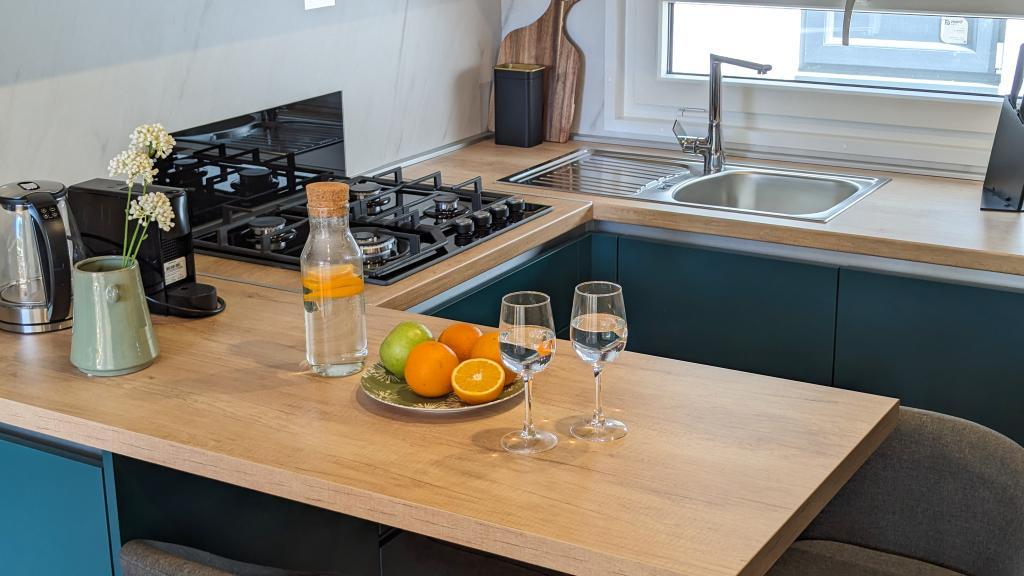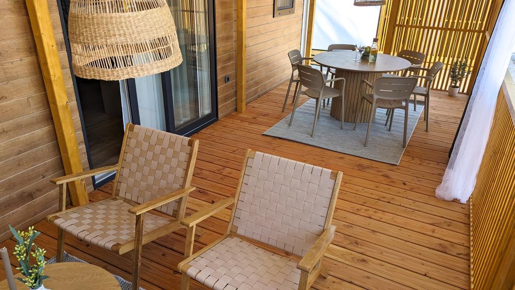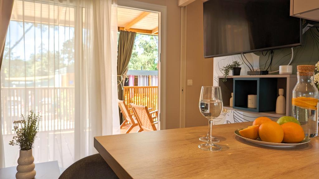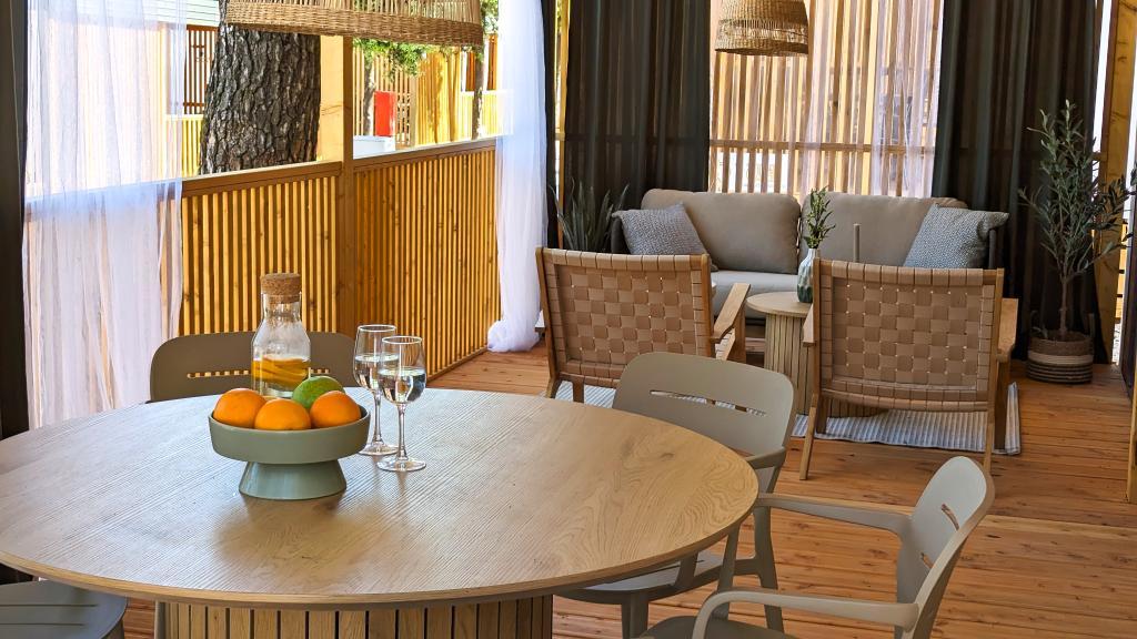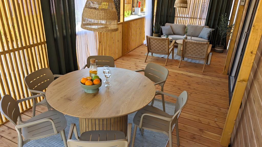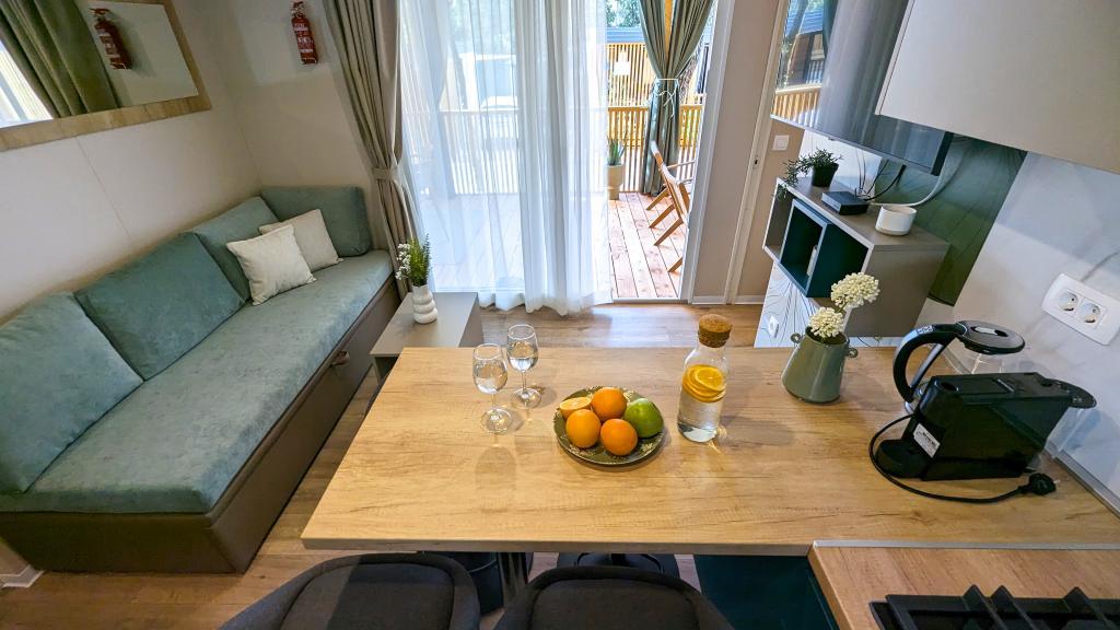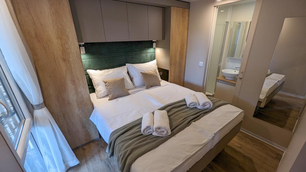 Bucurați-vă de natură și confort: rulotele Jaki de la Campingul Soline, Biograd na Moru. Situate într-o zonă liniștită a campingului de 4 stele, înconjurate de păduri de pini, rulotele noastre modern echipate sunt ideale pentru până la 6 persoane. Bucurați-vă de apropierea de plajă (2-5 minute de mers pe jos), magazine și restaurante, precum și de promenada care duce spre centrul orașului (15 minute). Aceste rulote oferă 2 dormitoare și 2 băi, un living, o terasă mare cu masă și zonă de lounge și o bucătărie complet utilată - mașină de spălat vase, cuptor cu microunde, aparat de cafea, prăjitor de pâine, blender, grătar în aer liber. Casa include, de asemenea, WiFi gratuit, parcare gratuită chiar lângă casă, Smart TV, aer condiționat, prosoape și lenjerie de pat. Campingul oferă numeroase facilități pentru întreaga familie: plaje frumoase cu nisip și pietriș care se întind până în centrul orașului, un restaurant cu specialități mediteraneene, un loc de joacă pentru copii, activități sportive și închiriere de biciclete. Dalmaland, cel mai mare parc acvatic tematic din Croația, se află la 15 minute de mers cu mașina.