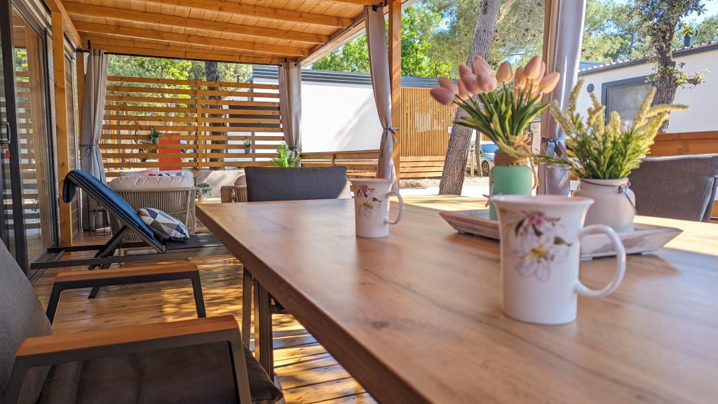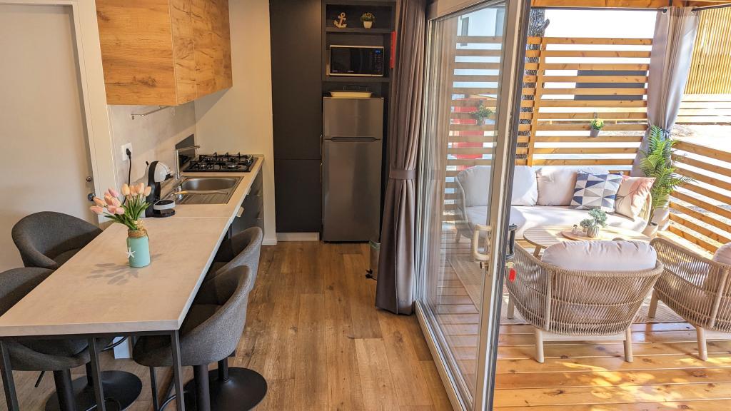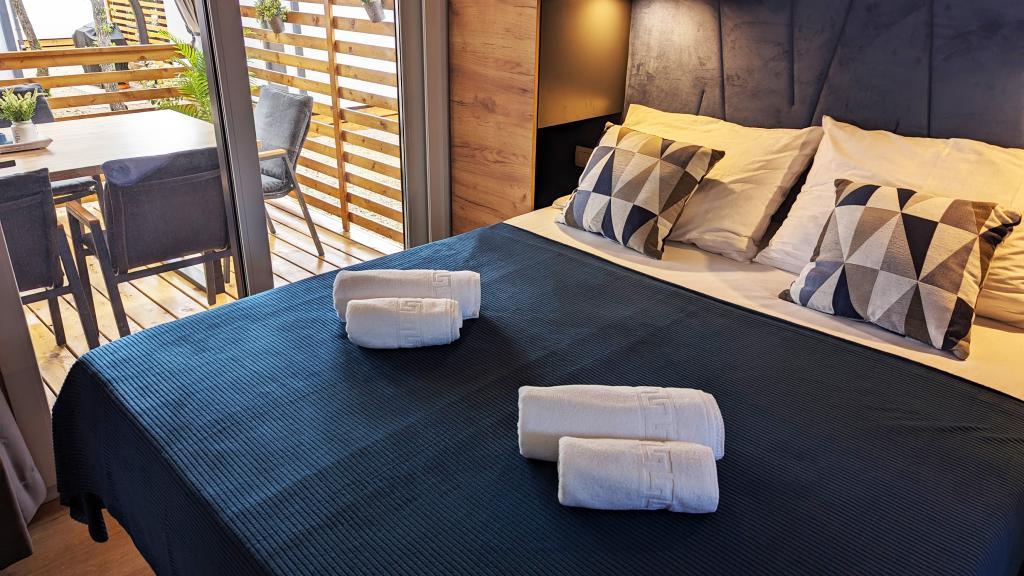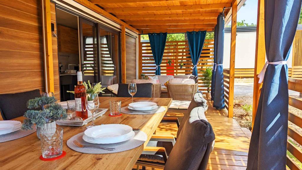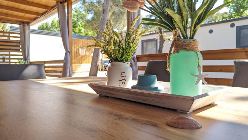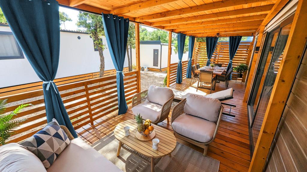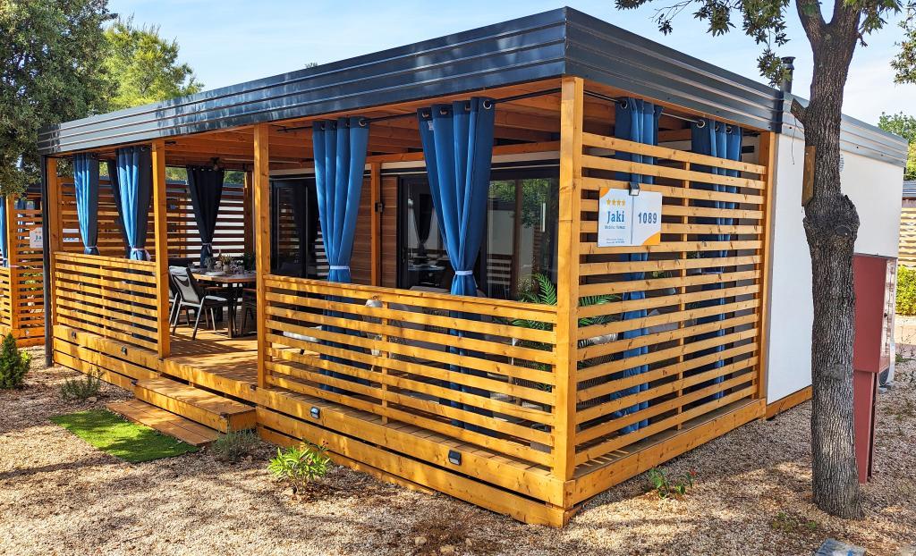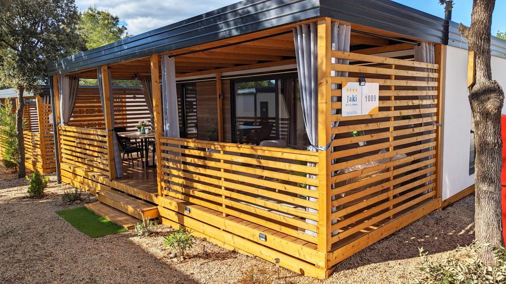 Bucurați-vă de natură și confort: rulotele Jaki de la Campingul Soline, Biograd na Moru. Situate într-o zonă liniștită a campingului de 4 stele, înconjurate de păduri de pini, rulotele noastre modern echipate sunt ideale pentru până la 6 persoane. Bucurați-vă de apropierea de plajă (2-5 minute de mers pe jos), magazine și restaurante, precum și de promenada care duce spre centrul orașului (15 minute). Aceste rulote oferă 2 dormitoare și 2 băi, un living, o terasă mare cu masă și zonă de lounge și o bucătărie complet utilată - mașină de spălat vase, cuptor cu microunde, aparat de cafea, prăjitor de pâine, blender, grătar în aer liber. Casa include, de asemenea, WiFi gratuit, parcare gratuită chiar lângă casă, Smart TV, aer condiționat, prosoape și lenjerie de pat. Campingul oferă numeroase facilități pentru întreaga familie: plaje frumoase cu nisip și pietriș care se întind până în centrul orașului, un restaurant cu specialități mediteraneene, un loc de joacă pentru copii, activități sportive și închiriere de biciclete. Dalmaland, cel mai mare parc acvatic tematic din Croația, se află la 15 minute de mers cu mașina.