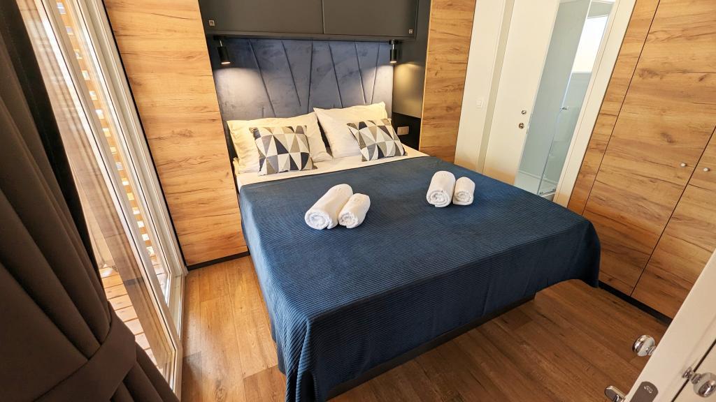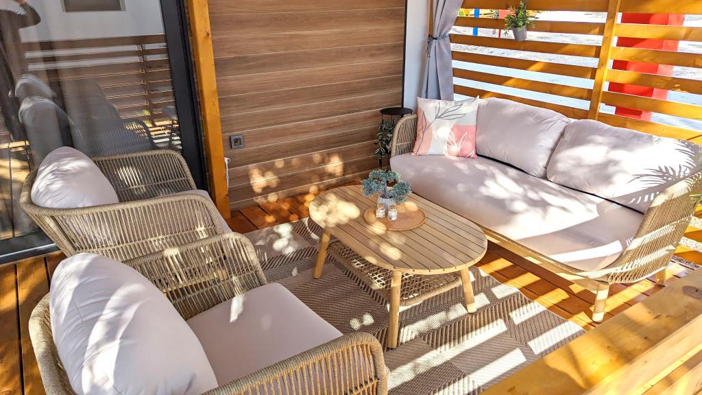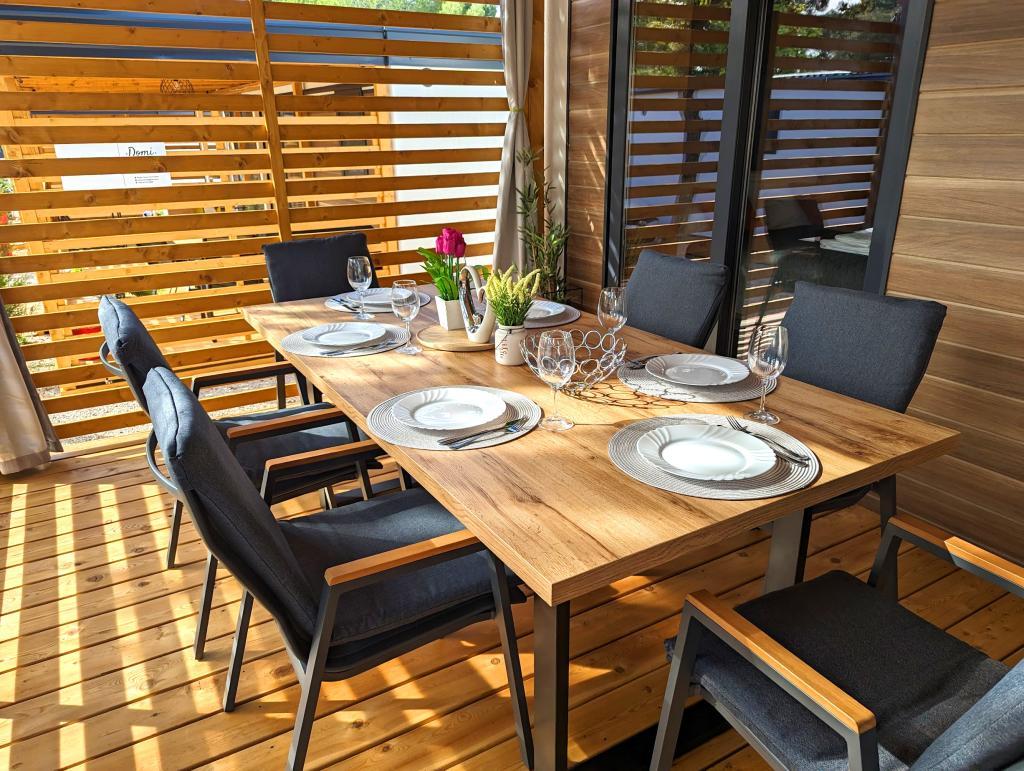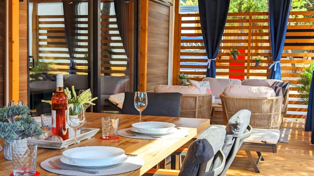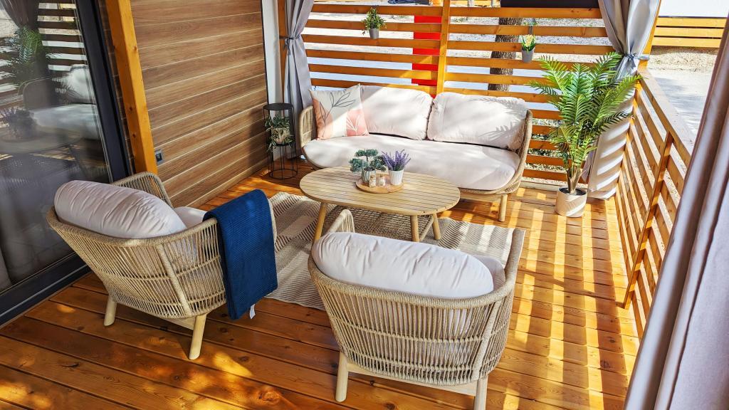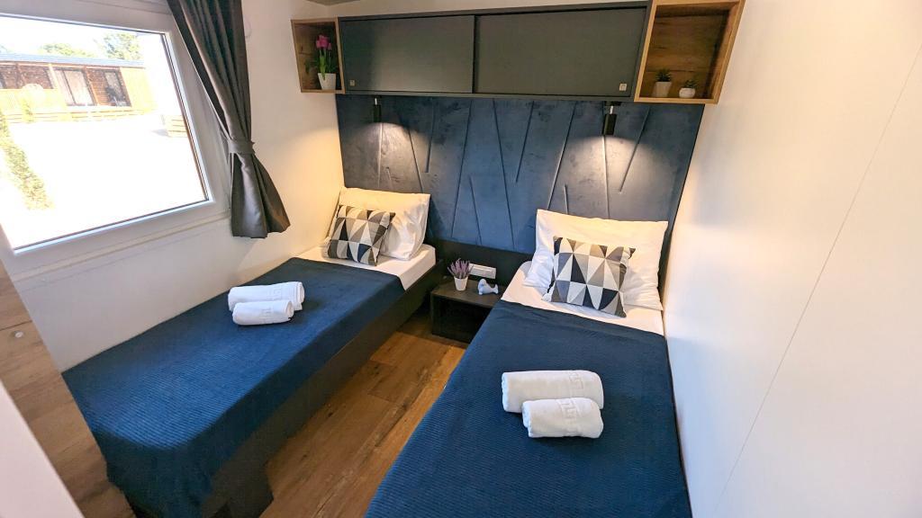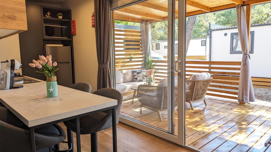 Bucurați-vă de natură și confort: rulotele Jaki de la Campingul Soline, Biograd na Moru. Situate într-o zonă liniștită a campingului de 4 stele, înconjurate de păduri de pini, rulotele noastre modern echipate sunt ideale pentru până la 6 persoane. Bucurați-vă de apropierea de plajă (2-5 minute de mers pe jos), magazine și restaurante, precum și de promenada care duce spre centrul orașului (15 minute). Aceste rulote oferă 2 dormitoare și 2 băi, un living, o terasă mare cu masă și zonă de lounge și o bucătărie complet utilată - mașină de spălat vase, cuptor cu microunde, aparat de cafea, prăjitor de pâine, blender, grătar în aer liber. Casa include, de asemenea, WiFi gratuit, parcare gratuită chiar lângă casă, Smart TV, aer condiționat, prosoape și lenjerie de pat. Campingul oferă numeroase facilități pentru întreaga familie: plaje frumoase cu nisip și pietriș care se întind până în centrul orașului, un restaurant cu specialități mediteraneene, un loc de joacă pentru copii, activități sportive și închiriere de biciclete. Dalmaland, cel mai mare parc acvatic tematic din Croația, se află la 15 minute de mers cu mașina.