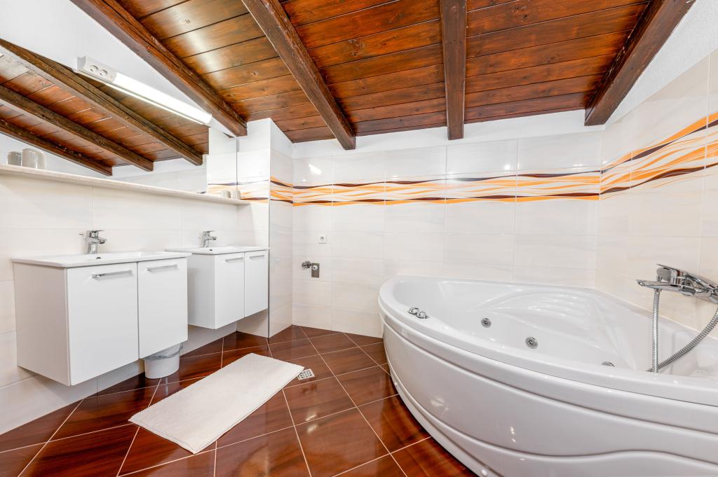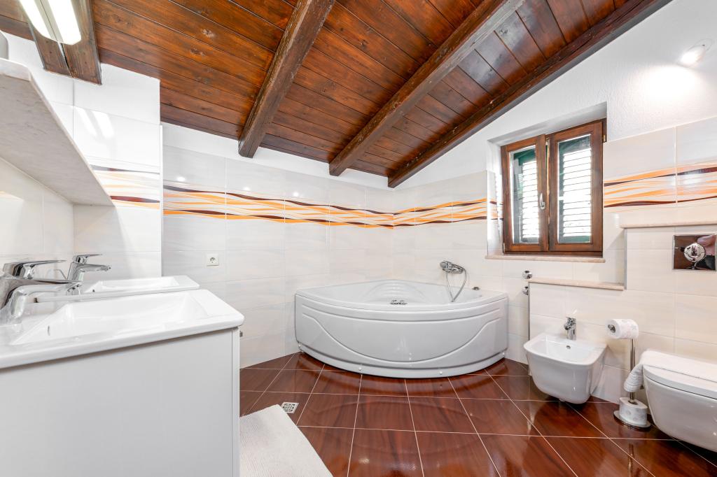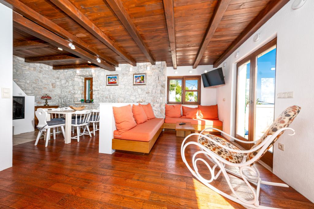 Bine ați venit în apartamentul nostru spațios și fermecător, situat într-o casă privată cu un total de trei apartamente - o alegere ideală pentru o vacanță liniștită și relaxantă într-o adevărată ambianță dalmată. Apartamentul de 115 m² oferă tot ce aveți nevoie pentru un sejur plăcut. Este format din două dormitoare confortabile, o bucătărie complet utilată, conectată la un living spațios, două băi (una dintre ele având o cadă cu hidromasaj) și o toaletă separată suplimentară. Decorul rustic și detaliile atent alese creează o atmosferă caldă și o atmosferă dalmată autentică. Casa este situată pe un teren în cascadă, iar scările duc la piscina comună. Piscina este situată pe o terasă spațioasă dotată cu șezlonguri și umbrele, perfectă pentru a face plajă și a vă bucura de priveliște. Datorită scărilor și configurației terenului, apartamentul nu este potrivit pentru persoanele cu dizabilități sau persoanele cu mobilitate redusă. Parcarea privată este disponibilă chiar lângă casă (ceea ce este un mare avantaj în lunile de vară). Așteptăm cu nerăbdare sosirea dumneavoastră!