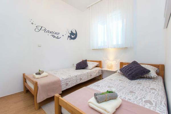 apartament utilat modern de 100 m2, situat în Brodarica, un sat liniștit câțiva kilometri de Sibenik. Apartament Piano este situat la numai 40 de metri de plajă și are vedere la mare. Se compune din doua dormitoare, baie, WC, bucatarie complet utilata, living spatios si terasa.