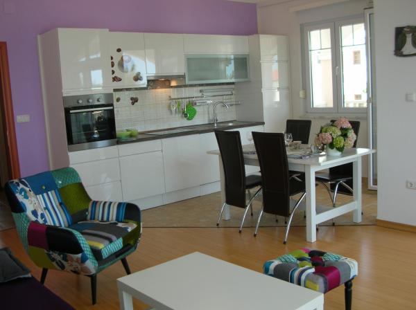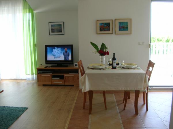 Vila Matane, casa cu trei apartamente (4 stele) într-un loc liniștit și însorită la doar cinci minute de la mare și plajă stâncoasă. Nr apartament 1 pentru 2 persoane, etaj 1, 50 m2, de Sud-Est, terasa acoperita (18 m2), vedere la mare. Camera de zi cu bucatarie deschisa, trage-out canapea pentru 2 persoane (160 cm x 200 cm), 1 dormitor cu un pat dublu (160 cm x 200 cm). Apartamentul nr 2, pentru două persoane, etaj 1 60 m2, terasa de sud-vest, parțial acoperită (18 m2), vedere la mare. Camera de zi cu bucatarie deschisa. Canapea ca un pat pentru două persoane (150 cm x 200 cm) și o canapea suplimentară. 1 dormitor cu un pat dublu (2x90 cm x 200 cm). SAT / TV, aer condiționat și încălzire centrală. bucatarie deschisa, complet echipate cu toate aparatele electrice necesare (4-sticlă ceramică plita, cuptor, mașină de spălat vase, frigider / congelator, cuptor cu microunde, filtru de cafea și prăjitor de pâine), feluri de mâncare pentru 6 persoane și prosoape de bucătărie. În baie (duș / WC), masina de spalat, uscator de par si prosoape.