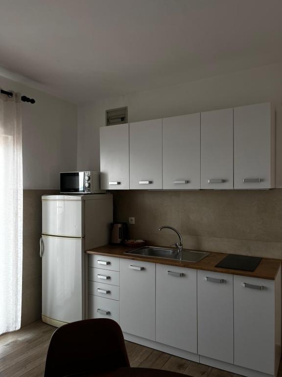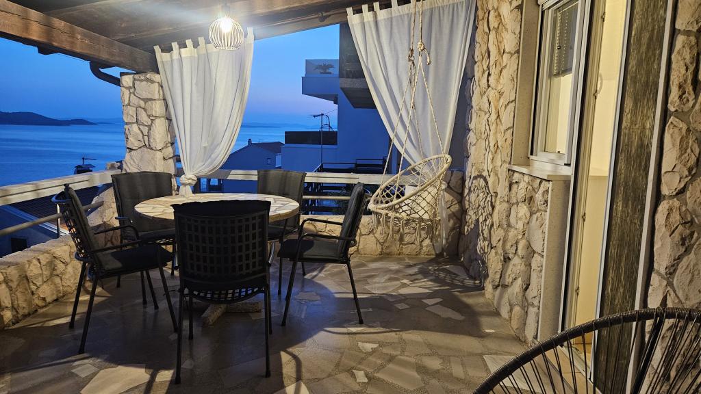 Apartamente complet echipate modern, într-o zonă liniștită, cu vedere frumoasă la mare, care se întinde până la Kornati. Apartamentele sunt situate în al doilea rând la mare, așa că trebuie doar să cobori scările spre mare, unde există plaje pavate, mare limpede și umbră frumoasă și miros de pini. Iar în imediata apropiere se află o plajă cu pietriș, care este un adevărat paradis pentru copii. Toate apartamentele noastre au parcare securizată, iar oaspeții pot folosi și grătarul comun. Restaurantele și cafenelele de pe plajă sunt la 5 minute. , iar cel mai apropiat magazin este la 10 minute de mers pe jos.