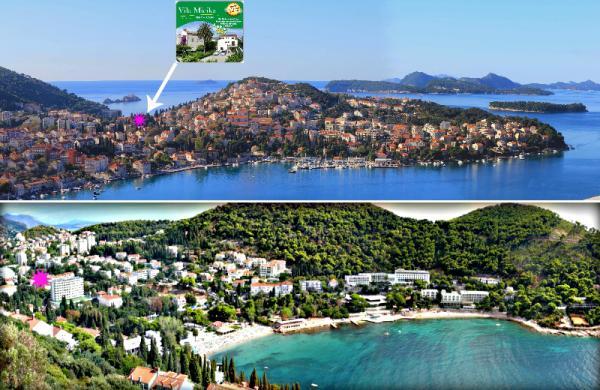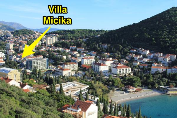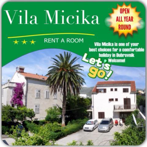 Villa Micika este cea mai bună soluție pentru o vacanță plăcută în Dubrovnik. Deschis pe tot parcursul anului, în timpul sărbătorilor de Crăciun, vacanțe și sărbători de Paște, Vila este potrivită atât pentru oamenii de afaceri, cât și pentru turiști. Vila este situată în centrul liniștit al orașului Dubrovnik numit Lapad, înconjurat de palmieri și alte vegetații mediteraneene. Este la numai 300 m de plaja principală și la 10 m de terenuri de tenis. Acesta are 8 camere clasificate cu 3 stele. Camerele au o capacitate de 12-15m2 și au 8 paturi duble și permit cazare totală pentru 16 persoane. Proprietatea este separată și este situată pe două etaje. Toate camerele au vedere spre zonele verzi frumoase și sunt dotate cu baie, duș, WC, TV-SAT, AIR-CON și toate camerele au un sistem de încălzire centrală. În cadrul proprietății există o terasă comună și o parcare auto off-road