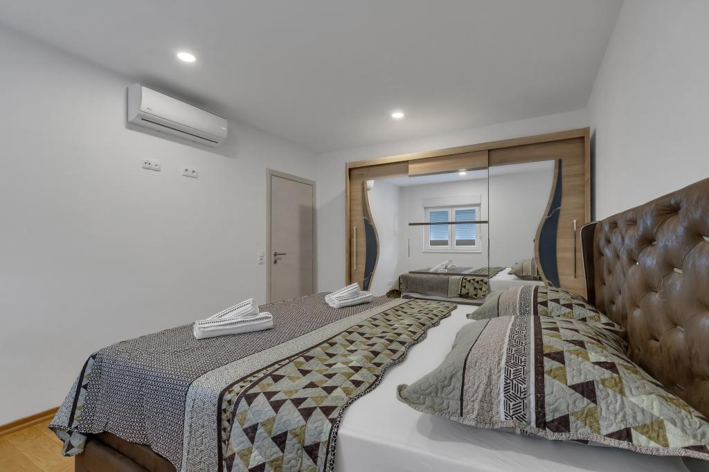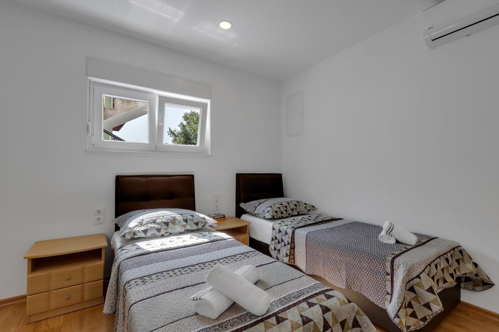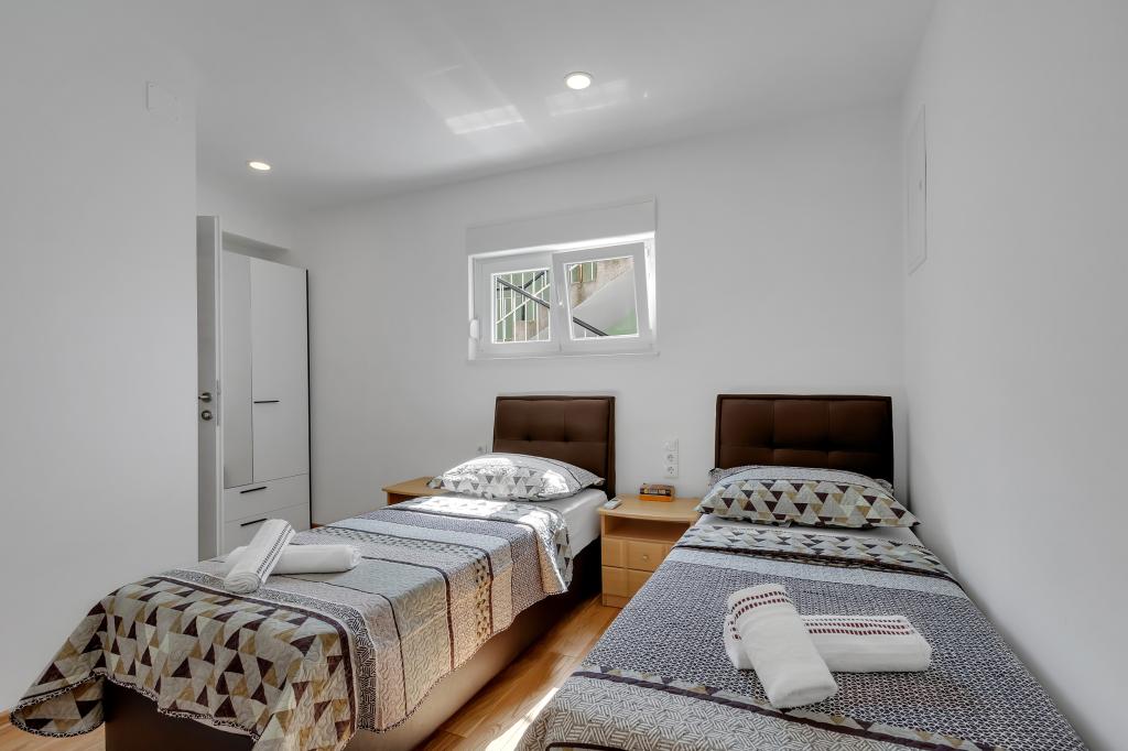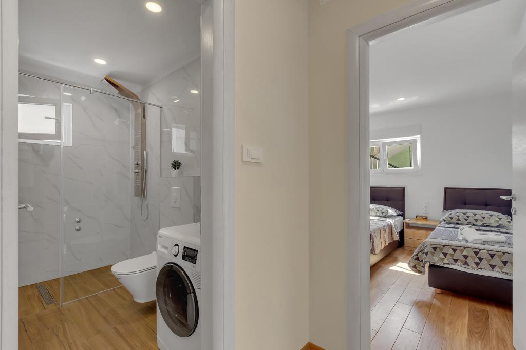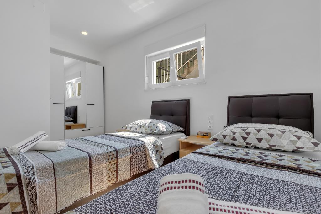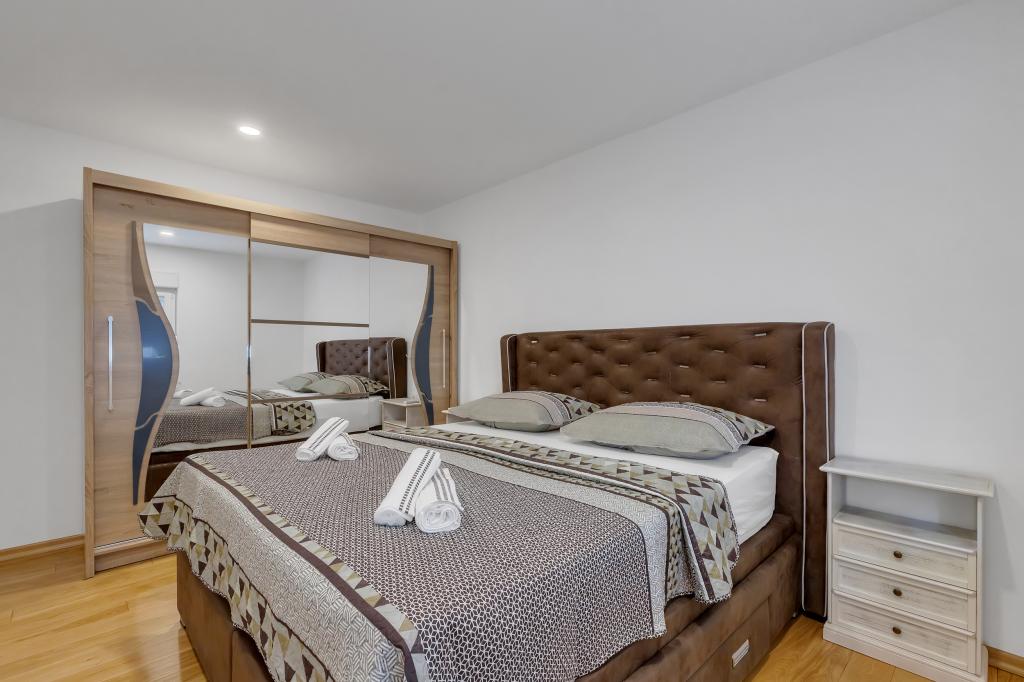 Apartament/apartament complet utilat cu doua camere (dublu, pat 180x200, iar celalalt cu 2x paturi separate care se pot conecta daca se doreste), 2 bai, living mare cu bucatarie (impreuna 40m2) Apartamentul are tot ce ai nevoie pentru o perioada lunga de timp. și sejur confortabil și este situat în centrul orașului Makarska