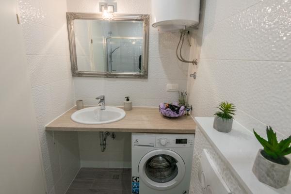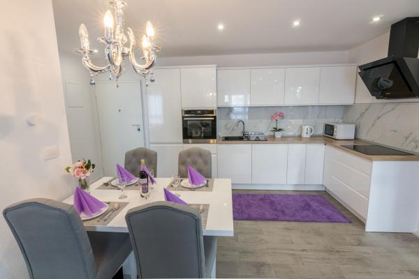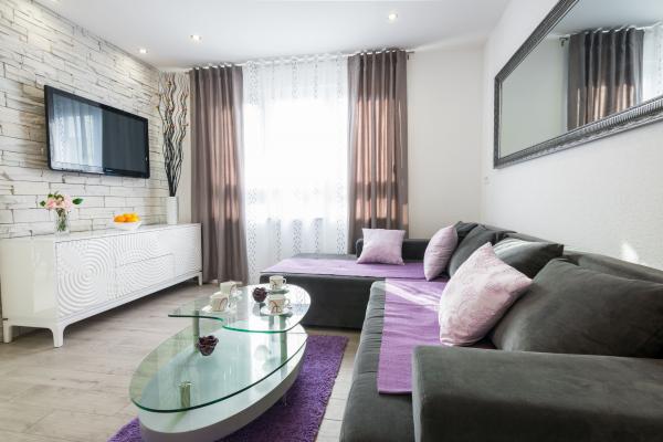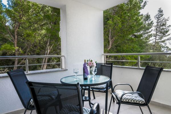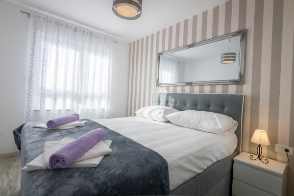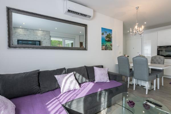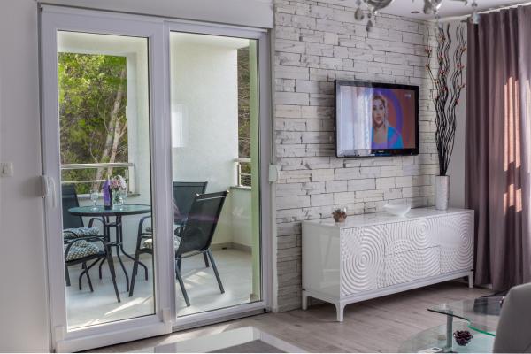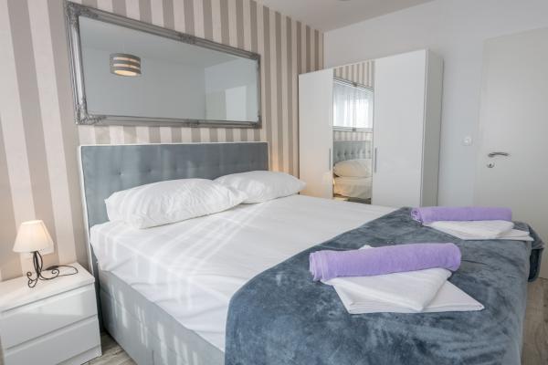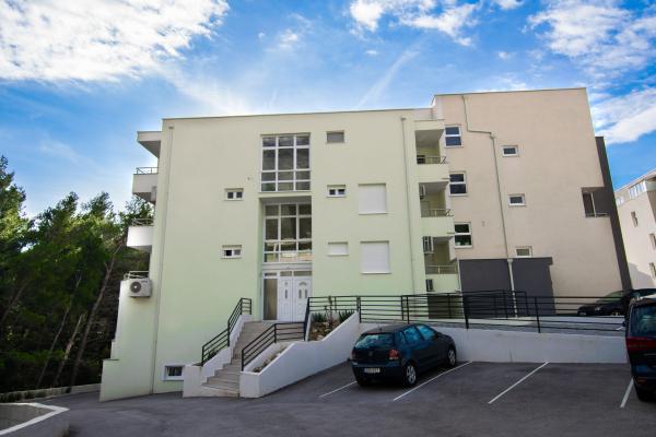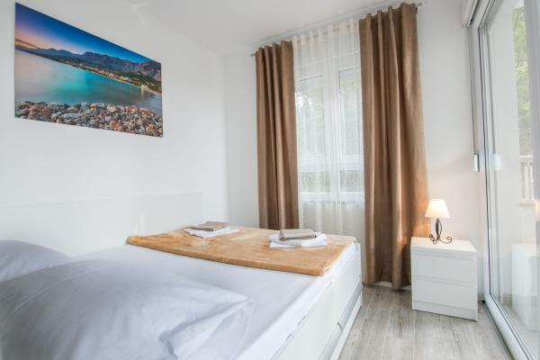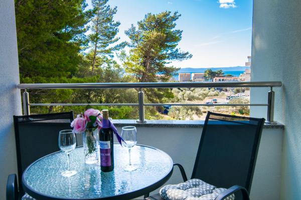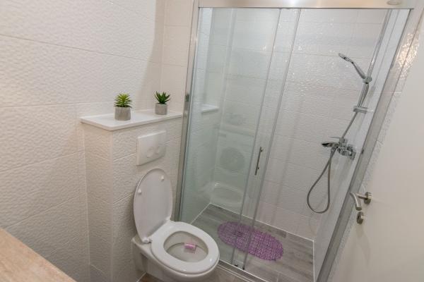 Apartament nou complet si utilat modern, cu vedere la mare, suprafata 60 m2. Apartamentul este compus din doua dormitoare, cu paturi mari, baie, bucatarie, terasa. Este dotata cu aer conditionat, internet WI-FI, si dispune de parcare privata proprie, care este gratuita pentru oaspeti. Apartamentul este situat intr-un mediu linistit langa o padure de pini, si este izolat de zgomotul auto. Departe de plajă, mare la aproximativ 650-700 de metri, la 5-6 minute de mers pe jos, de la stația de autobuz tot aproximativ 600-700 de metri, de centru la aproximativ 900 de metri.