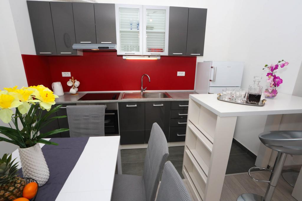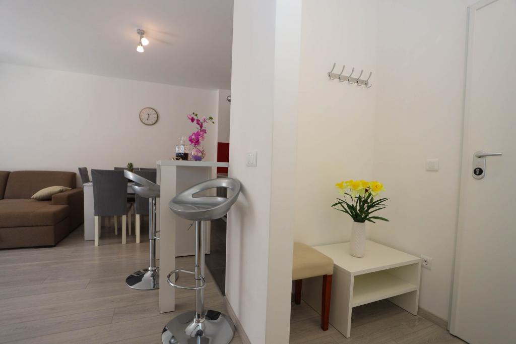 Apartament modern utilat, la primul etaj al unui bloc rezidențial nou, cu lift. Apartamentul are tot ce aveți nevoie pentru o ședere plăcută în vacanță. Apartamentul Petra este format dintr-o sufragerie cu bucătărie utilată, un living cu o canapea extensibilă care servește drept pat suplimentar, o baie și o toaletă mică și două dormitoare. O cameră are un pat dublu, iar cealaltă are două paturi care pot fi separate, dacă este necesar. Proprietatea este situată la 5 minute de mers pe jos de centru sau de cea mai apropiată plajă. În apropiere se află un magazin și un teren de sport pentru recreere.