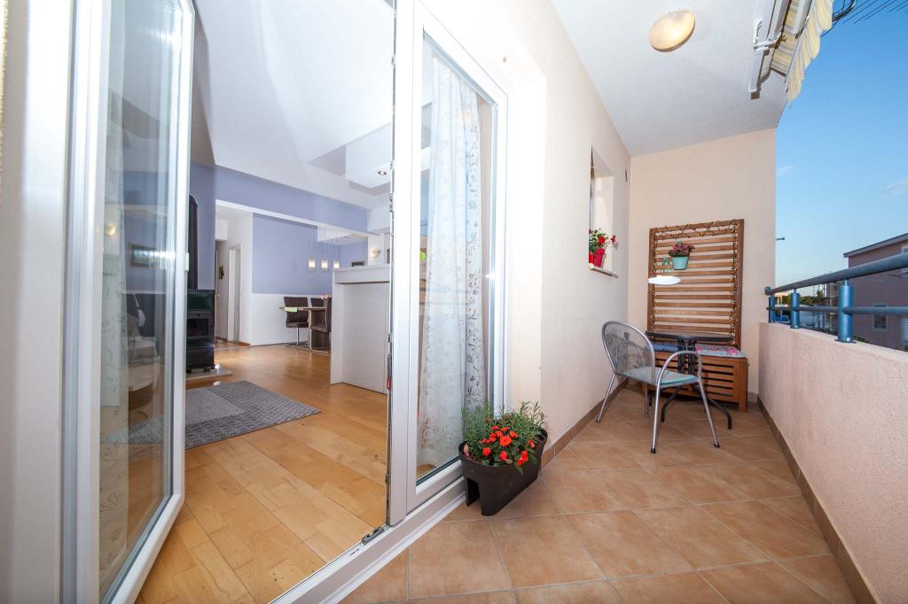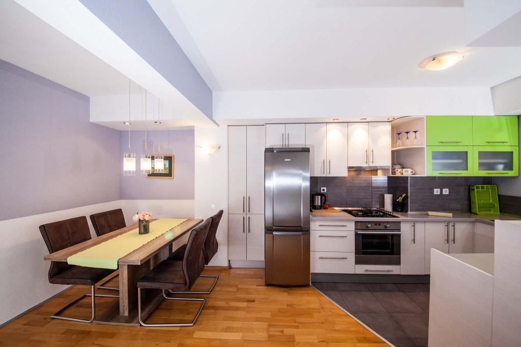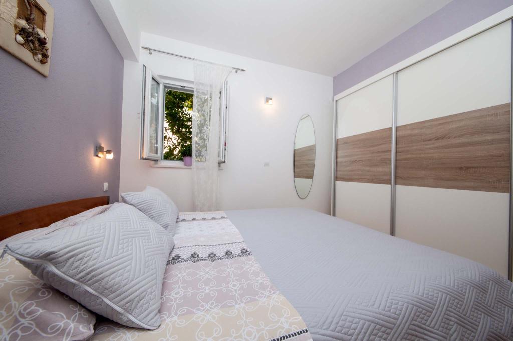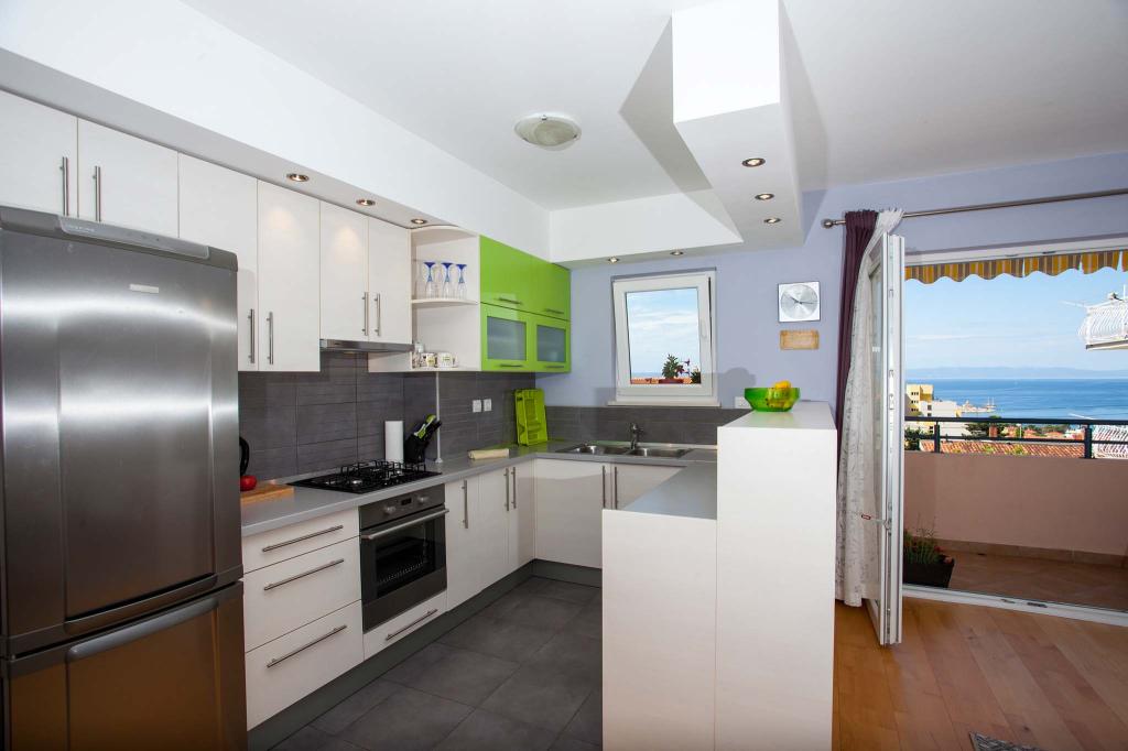 Apartament cu doua camere de 80m2, intr-o zona linistita a orasului. Balcon cu vedere la mare și la munte. Echipat complet. Baie și toaletă suplimentară. Două camere și un pat suplimentar