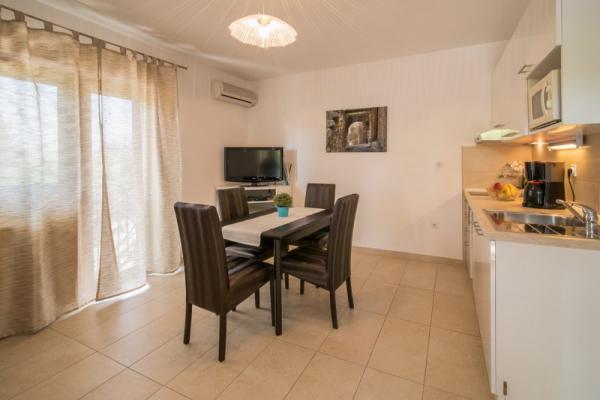 Vegetaţie mediteraneană, îmbătător miros de mare, linişte şi pace, aproape de plaja, restaurante şi magazine descrie cel mai bine locul unde apartamentele noastre. 250 m distanţă de golf frumos de tranşee şi de 1500m de la centrul de Malinska o alegere ideala pentru o vacanta de familie ta. Parterul casei noastre sunt două apartamente şi oferă cazare pentru 4-5 persoane. Fiecare apartament are o terasă privată, grădină comună şi parcare privată. În casa noastră de viitor este de apartamente noi si moderne, cu două dormitoare şi trei terase, care oferă cazare pentru 6 persoane. Ea are propria intrare, curte, parcare si toate posibilităţile pentru o casa paşnică şi confortabil. Apartamentele sunt dotate cu TV prin satelit şi acces la internet wireless.