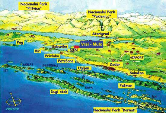 Apartamentul este situat în Vrsi, o peninsula situata in partea de nord-vest a Dalmația de Nord, la 20 km de Zadar, la 7 km distanță de stațiunile turistice Bay și la 5 km de cel mai vechi oras croat regal din Nin. Apartamentul este 125m2, complet echipate și are o terasă cu vedere la mare; ideal pentru vacanțe în liniște, departe de centrul orașului.