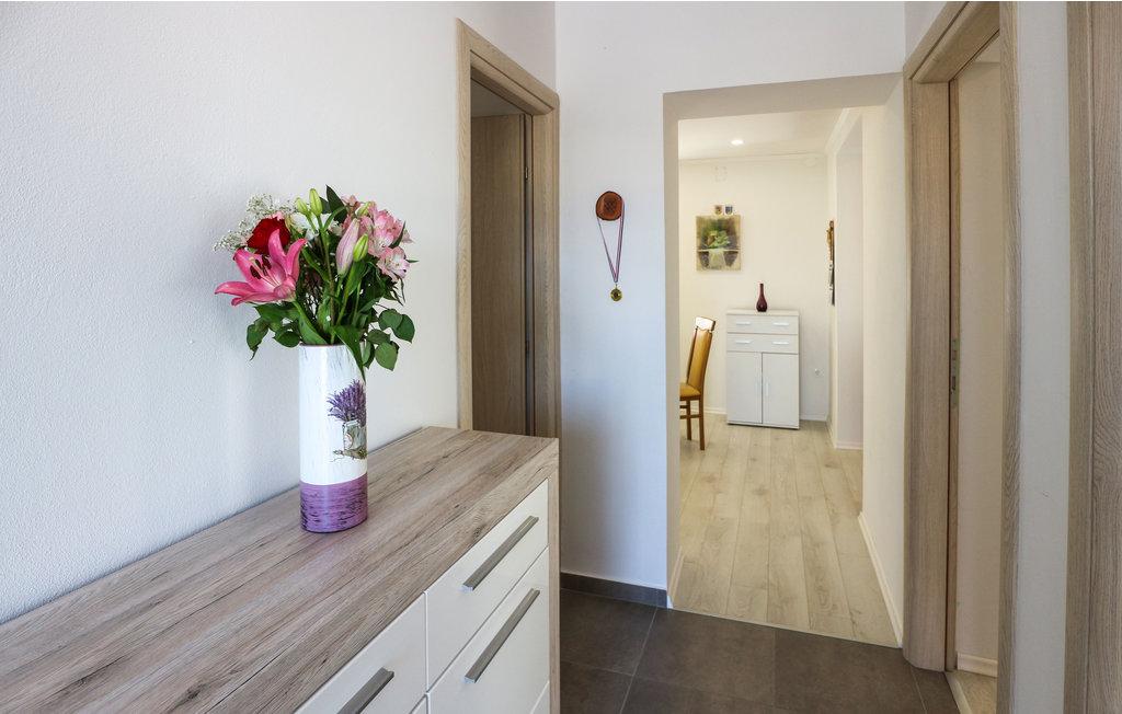 Apartamentul este situat la parterul superior al unei case de familie în centrul orașului. Oaspeții au la dispoziție un loc de parcare în grădină. Acesta este format din două dormitoare duble, o baie, o bucătărie cu sufragerie și o terasă plăcută. Toate facilitățile necesare sunt în apropiere - magazine, restaurante, cafenele și alte atracții ale orașului, ceea ce îl face o alegere ideală pentru un sejur plăcut și lipsit de griji.