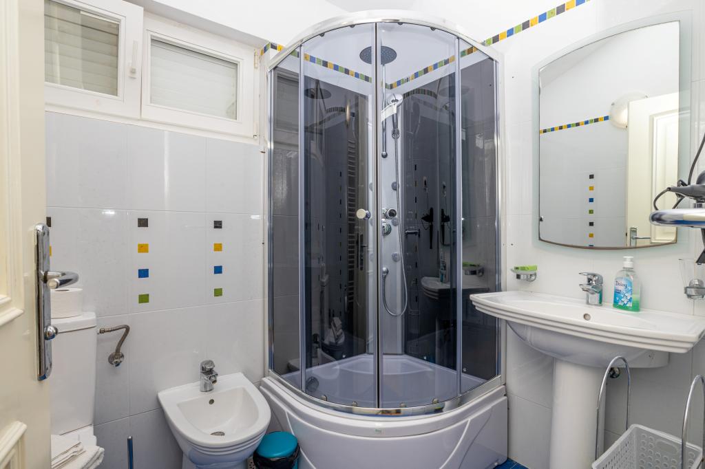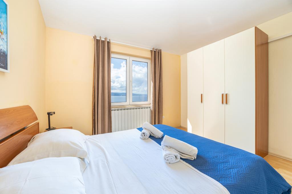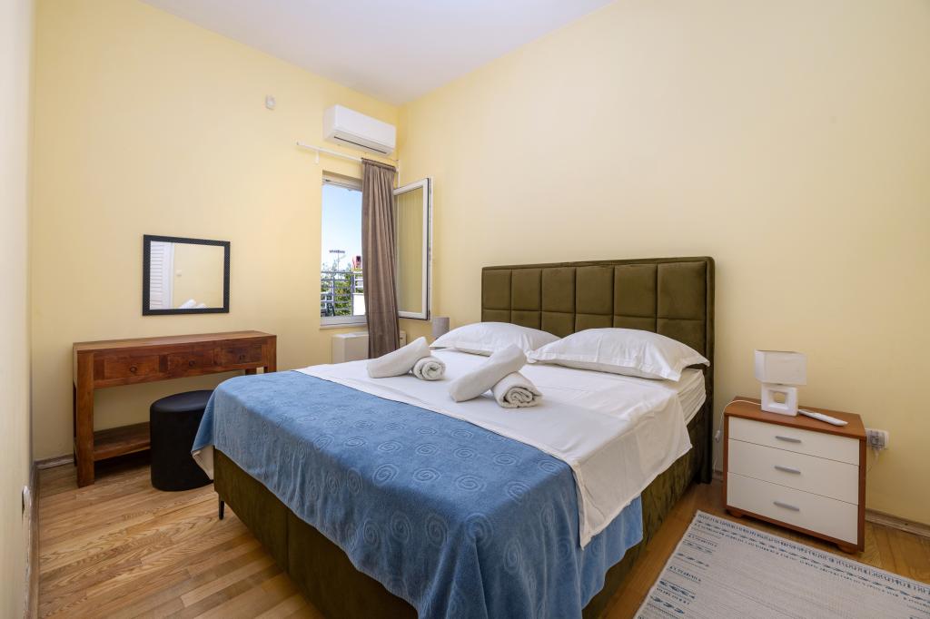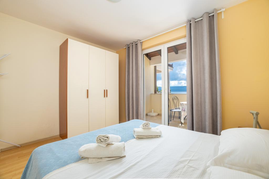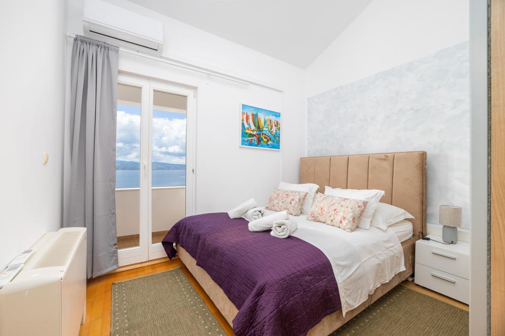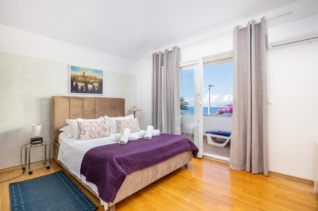 Cazare în apartamente nou construite, extrem de confortabile și superb echipate. Facilitatea este situată la 3 km de centrul orașului Omiš. Un total de opt apartamente, situate în primul rând la mare. Toate apartamentele au terase mari cu vedere la mare și la insula Brač. Locuri de parcare chiar lângă vilă. Apartamentele sunt situate sub drumul principal (300 de metri), chiar lângă mare și o plajă mare cu pietriș. Există patru tipuri de apartamente: -- tip 2+2 cu un dormitor dublu separat și un living cu două paturi, -- apartamente tip 2+2 studio mare, -- apartamente luxoase mari, tip 4+2, cu două dormitoare duble și un living mare cu două paturi extensibile și -- apartament de lux mare, tip 14+2, în realitate o vilă pe trei etaje, cu o suprafață de 300 m2, cu o piscină de 9x4 metri cu apă încălzită, cu șapte dormitoare duble, două livinguri mari cu balcoane și terase, patru băi, toaletă separată, grătar în aer liber, saună și sală de sport etc. Piscina este utilizată exclusiv de apartamentul A 14+2. Celelalte apartamente nu.