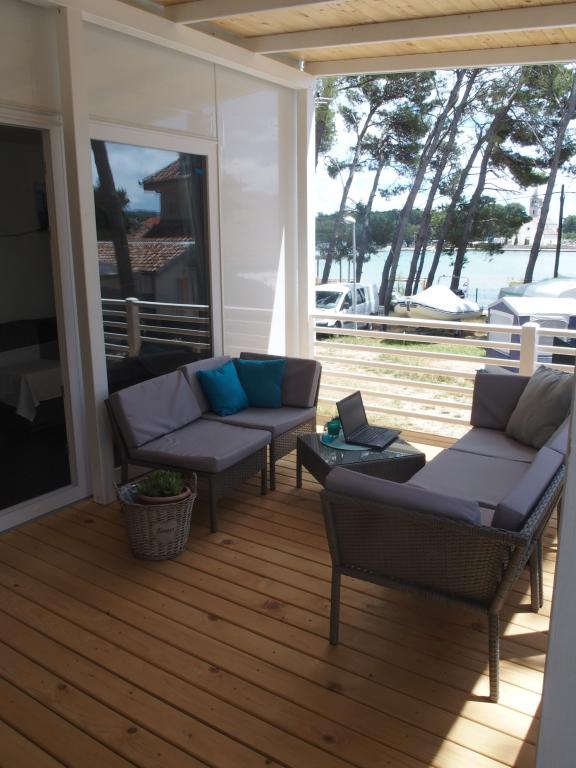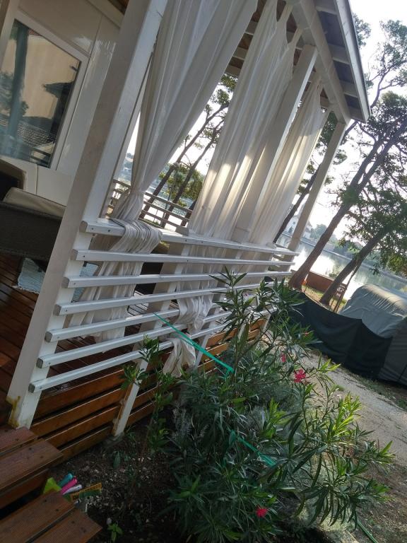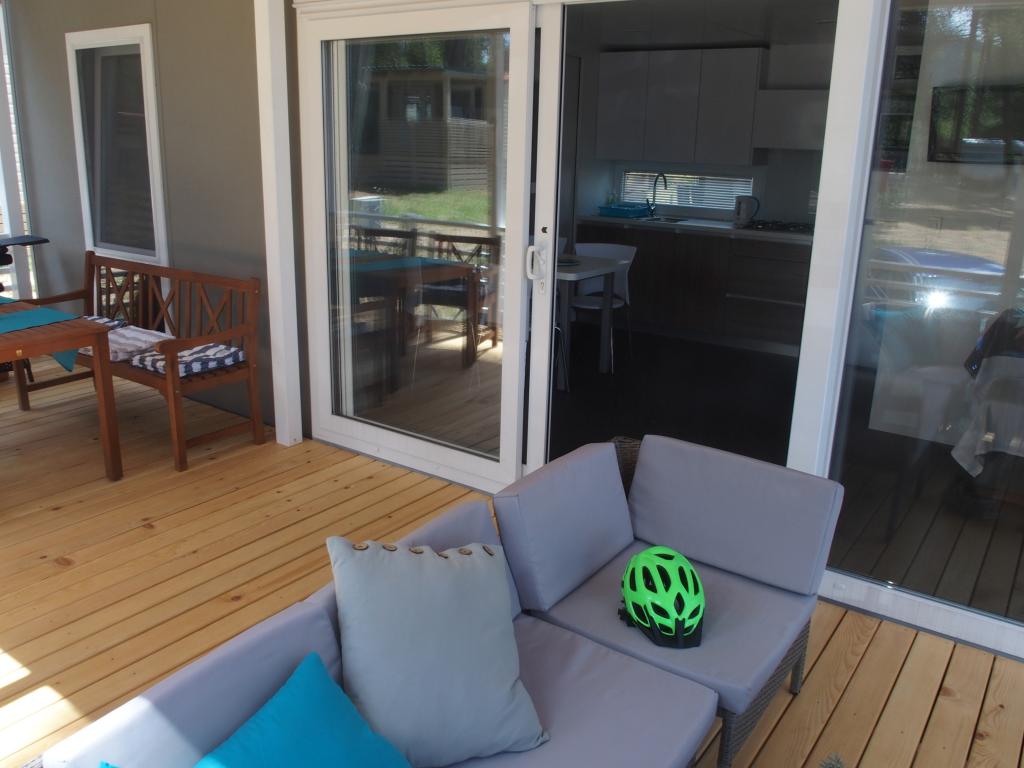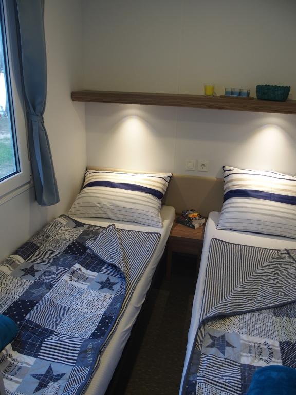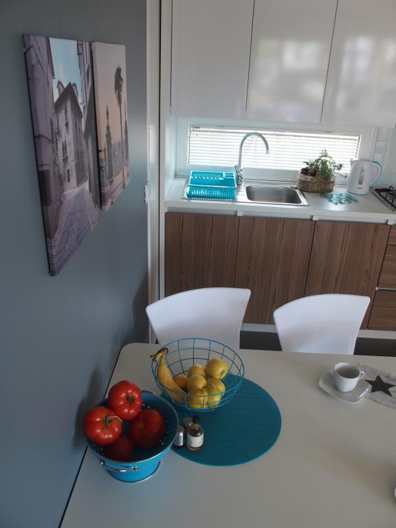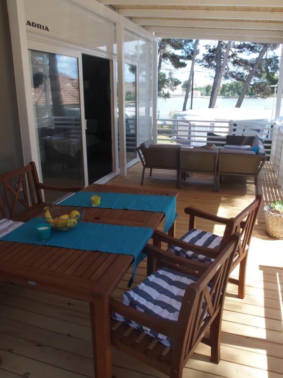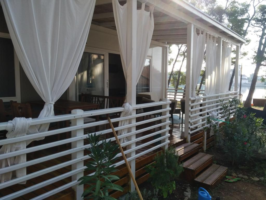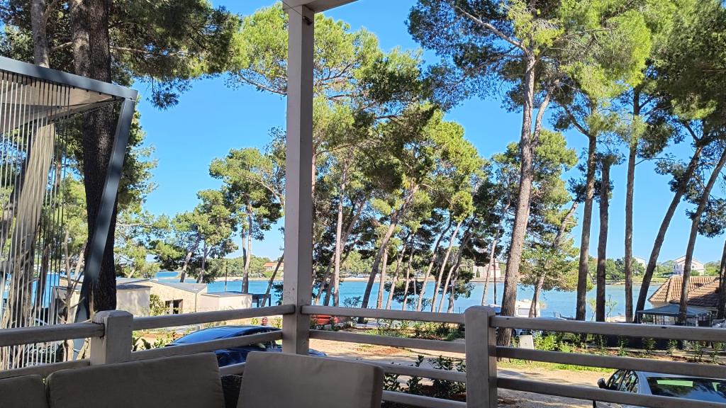 Rulota de lux este situată în „umbra profundă” naturală a unei păduri de pini, la doar 20 m de plaja cu nisip. Cu o terasă deschisă mare cu vedere la mare, 2 dormitoare, o bucătărie și o baie complet utilate și un living spațios cu o canapea extensibilă suplimentară, această casă de vacanță este alegerea perfectă pentru o vacanță relaxantă în familie. Oferă cazare confortabilă pentru 4 persoane, în timp ce capacitatea maximă este de 4 + 1 persoană. Terasa are o zonă de relaxare, o masă pentru până la 6 persoane, precum și un grătar pe gaz. La doar 20 m distanță se află o plajă frumoasă și sigură, cu un fund marin nisipos, care se întinde de la un capăt la altul al golfului. De-a lungul coastei, la câțiva kilometri în ambele direcții, există alte plaje de diferite tipuri pe care le puteți explora. În interiorul taberei, oaspeții au acces la o piscină cu o zonă de plajă mobilată cu șezlonguri gratuite, precum și la o cafenea-bar, iar terasa casei este amplasată astfel încât să aveți o vedere deschisă asupra întregului golf și a piscinei.