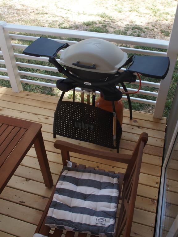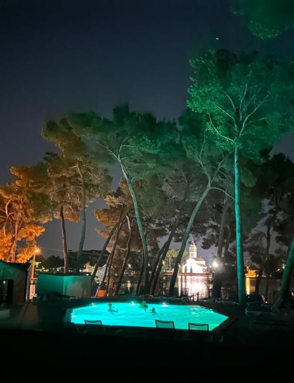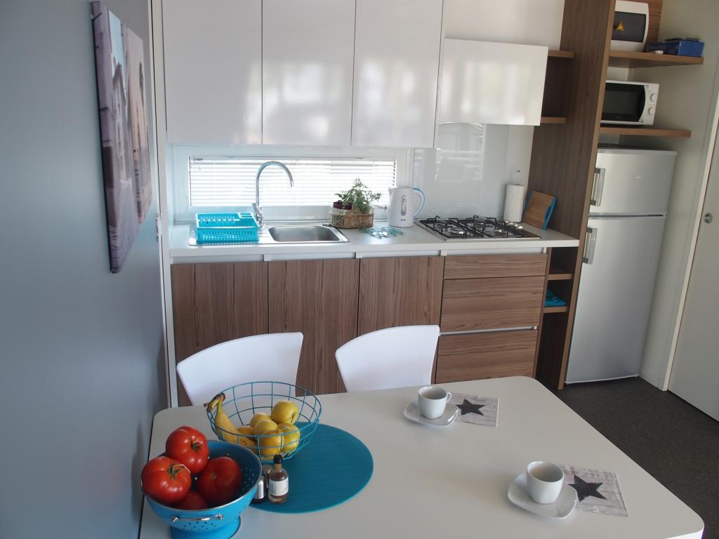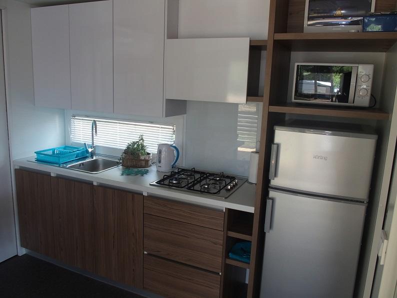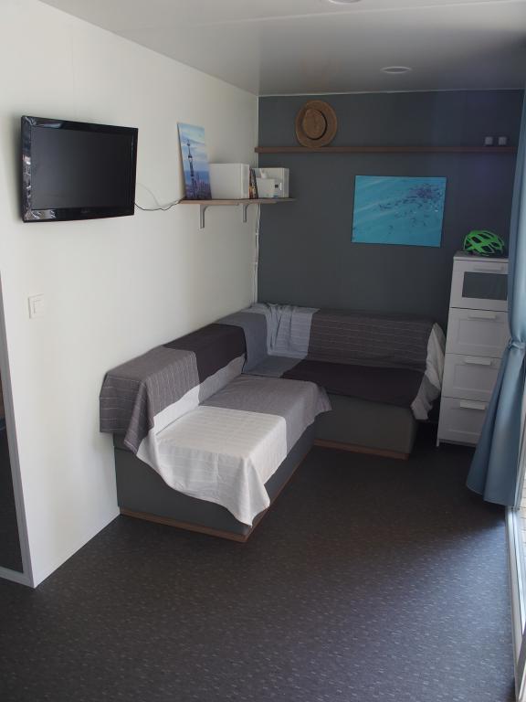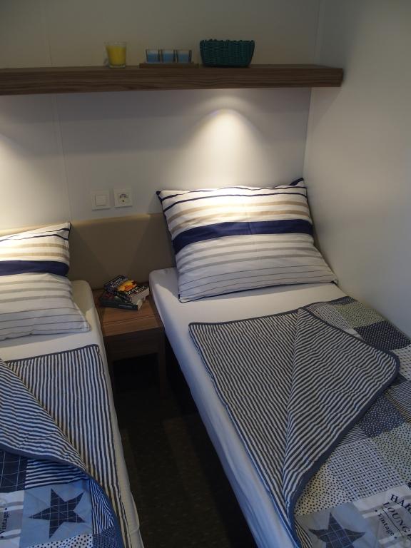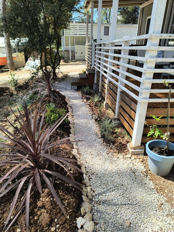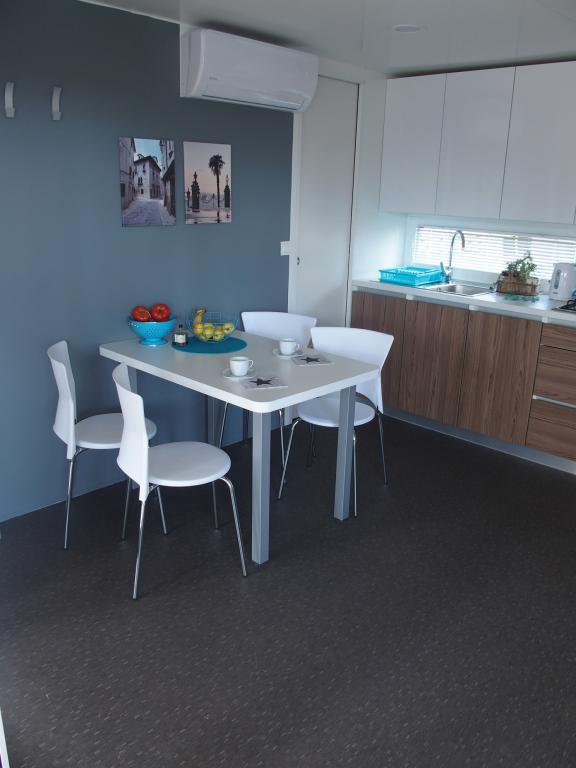 Rulota de lux este situată în „umbra profundă” naturală a unei păduri de pini, la doar 20 m de plaja cu nisip. Cu o terasă deschisă mare cu vedere la mare, 2 dormitoare, o bucătărie și o baie complet utilate și un living spațios cu o canapea extensibilă suplimentară, această casă de vacanță este alegerea perfectă pentru o vacanță relaxantă în familie. Oferă cazare confortabilă pentru 4 persoane, în timp ce capacitatea maximă este de 4 + 1 persoană. Terasa are o zonă de relaxare, o masă pentru până la 6 persoane, precum și un grătar pe gaz. La doar 20 m distanță se află o plajă frumoasă și sigură, cu un fund marin nisipos, care se întinde de la un capăt la altul al golfului. De-a lungul coastei, la câțiva kilometri în ambele direcții, există alte plaje de diferite tipuri pe care le puteți explora. În interiorul taberei, oaspeții au acces la o piscină cu o zonă de plajă mobilată cu șezlonguri gratuite, precum și la o cafenea-bar, iar terasa casei este amplasată astfel încât să aveți o vedere deschisă asupra întregului golf și a piscinei.