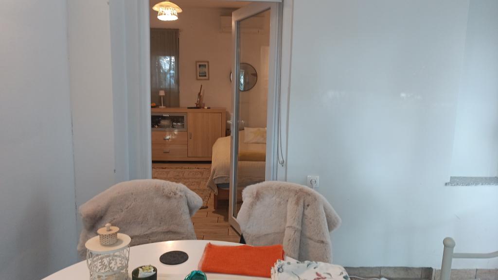 Apartamentul Log Inn este situat la primul etaj al unei case cu doar două apartamente, într-o alee liniștită, ideală pentru relaxarea familiilor. Grădina casei este umbroasă, cu măslini, smochini și pini, cu un loc de parcare în curte. Centrul orașului, cu magazine, brutării, cofetării, cafenele și restaurante, se află la 10 minute de mers pe jos, iar prima plajă cu pietriș este la doar 5-10 minute de mers pe jos. Log Inn este plăcut de stat indiferent de vreme, spațios și cu o cameră separată cu un living cu jucării și cărți ilustrate. Este bine echipat (veselă, fierbător, aparat de cafea, max-tv, wlan, aer condiționat), iar în living, în serile de primăvară, se poate relaxa lângă focul din soba groasă. Terasa cu mobilier de grădină este plăcută, iar oaspeții sunt bucuroși să ia micul dejun pe ea, să se bronzeze sau să se bucure de seară. Studioul este mai mic și cu o chicinetă mai mică, dar datorită grădinii este plăcut chiar și pe căldura verii. Dotări pentru bebeluși, dacă vin: pătuț de călătorie, creșă, jucării, saltea etc. Ambele apartamente au răcire și încălzire. În extrasezon, acestea sunt închiriate cu reduceri și lunar.