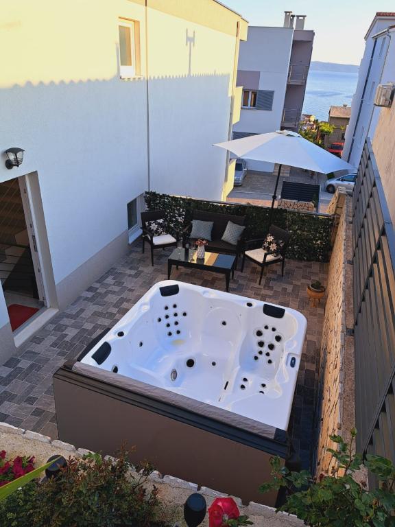 Apartamentul nou si complet utilat este situat intr-o zona linistita cu vedere superba la mare.Ideal pentru vacanta ta linistita cu familia.Apartamentul are tot ce ai nevoie, un gratar, doua terase dintre care una are jacuzzi, care poate fi folosit doar de oaspetii apartamentului.si doua locuri de parcare.O frumoasa plaja cu pietris este la zece minute de mers pe jos.Ca gazde va stam la dispozitia dumneavoastra 24 de ore din 24.Speram ca veti alege apartamentul nostru pentru vacanta ta si asteptam cu nerabdare sosirea ta.