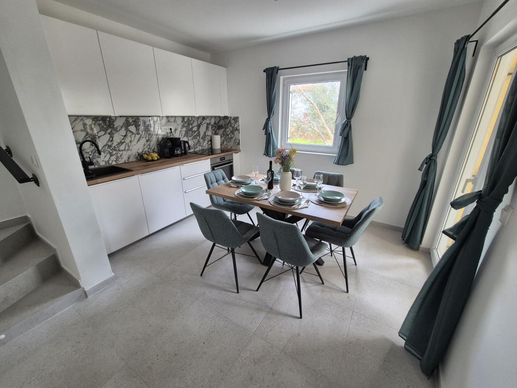 Apartament complet utilat, cu două dormitoare cu aer condiționat, o terasă la primul etaj, o loggie la parter și parcare privată, într-o zonă liniștită din Prek, lângă plaja cu nisip Jaz.