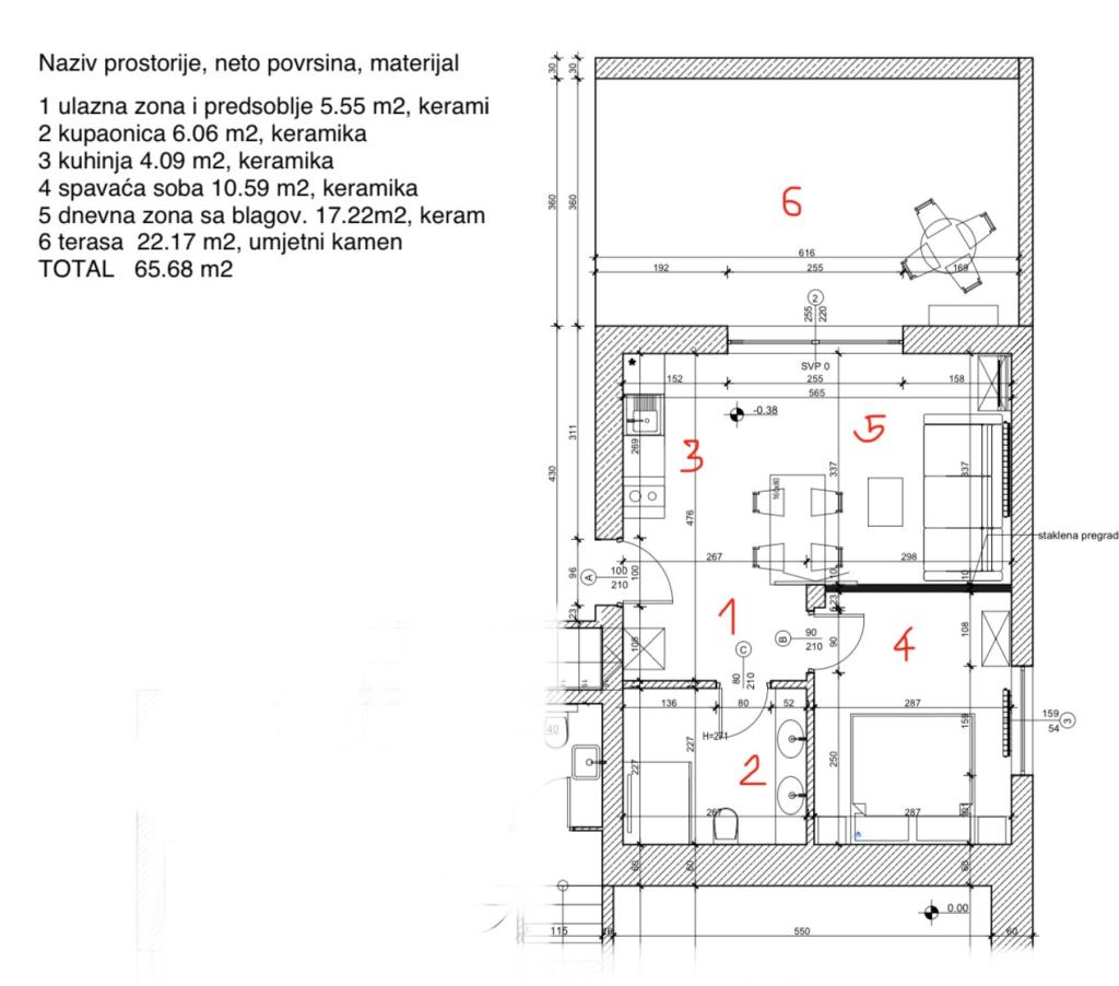 Apartamentul cu un dormitor, cu o suprafață de 45 m², este potrivit pentru cupluri, familii sau orice alt grup de 2-4 persoane, cu posibilitatea unui pat dublu suplimentar sau a unui pătuț pentru copii la cerere. Proprietatea include două locuri de parcare private și o terasă la parter, orientată spre est și vest, permițându-vă să vă bucurați de dimineți însorite și cafea în aer liber, precum și de apusuri de soare și seri plăcute într-o atmosferă intimă. Interiorul apartamentului este recent dotat cu toate electrocasnicele de care ați putea avea nevoie în timpul sejurului, cum ar fi aer condiționat, Wi-Fi, TV prin satelit, aparat de cafea, mașină de spălat vase, mașină de spălat rufe, cuptor portabil, fier de călcat, uscător de păr și multe altele. Dormitorul, cu un pat king-size nou și confortabil, are un perete de sticlă care vă permite să vă bucurați de priveliște chiar și din pat, dar și de intimitate completă trăgând draperiile. Baia include o chiuvetă dublă, toaletă, bideu și un duș spațios.