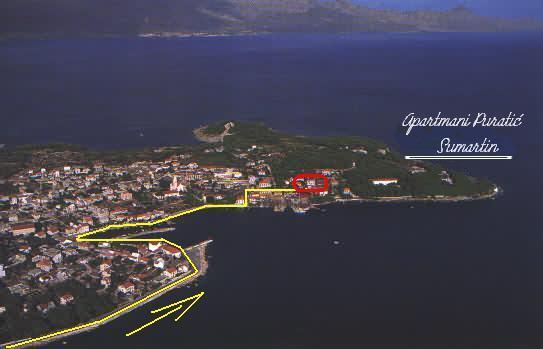Apartamentul este situat Puratic într-un sat liniștit de pe coasta de est a insulei. Situat la doar 30 de metri de mare, este ideal pentru o vacanță de familie liniștită. Suprafața sa este de 100m2 cu trei dormitoare, baie, bucatarie si sala de mese, precum și o terasă în aer liber 150m2 cu cabină de duș. Există cuptor cu lemne și grătar. În subsol există o sală de jocuri în 50m2 cu tenis de masă, darts, foosball. . .