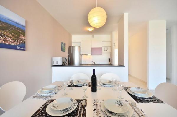Apartamentele echipate modern BRETIA sunt situate în Sutivan, la câțiva pași de toate atracțiile și facilitățile care vă vor face șederea mai plăcută și mai simplă. Cu o parcare privată securizată inclusă în prețul unei promenade de 200 m lungime pe malul apei, plajă și centrul din Sutivan va deveni drumul tău zilnic de drumeție. De asemenea, există facilități pentru oaspeții apartamentului, precum piscină, șezlonguri, umbrele de soare, grătar, cameră de joacă pentru copii, terasă pe acoperiș, biciclete gigant. . Pentru o ședere mai confortabilă, apartamentele sunt dotate cu televizoare LED LCD inteligente, internet Wi-Fi, echipament de bucătărie. . Așteptăm cu nerăbdare sosirea ta!