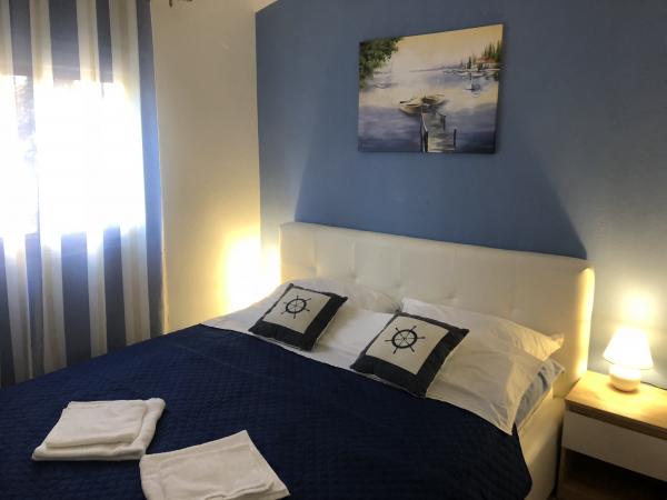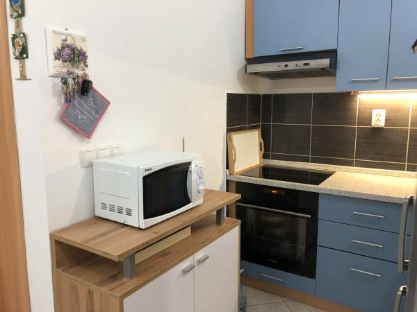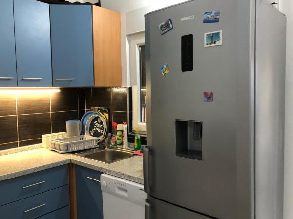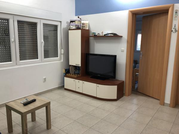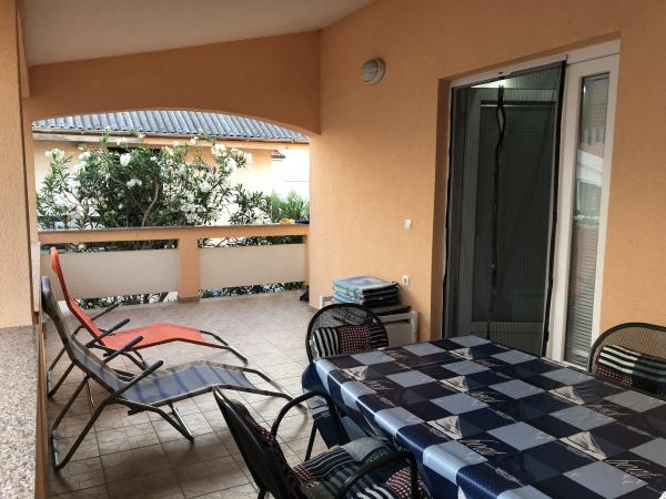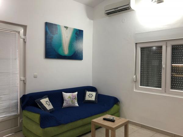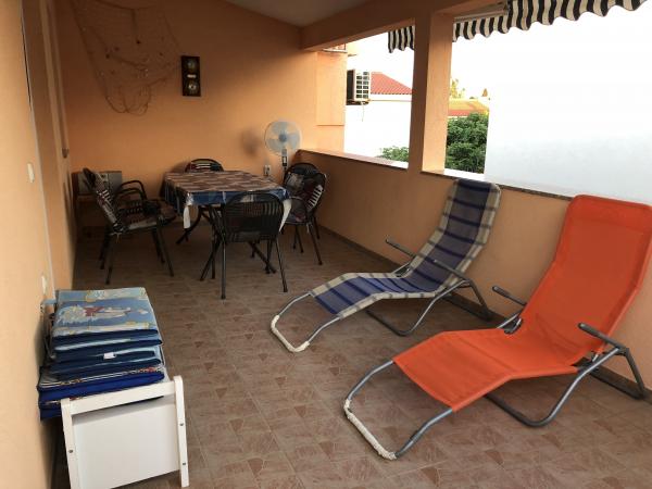 Apartament dotat modern la 200 m de plajă și situat în prima parte a insulei. Apartamentul (60 m2) este situat la primul etaj si este format din doua dormitoare (un pat dublu si doua paturi separate). Living spațios cu bucătărie, baie, TV cu ecran plat și internet WiFi. Bucătăria are mașină de spălat vase, cuptor cu microunde, frigider mare, ceainic, cuptor și plită. Terasa spatioasa (15 m2) are copertina si este acoperita; pe terasa sunt sezlonguri si o masa spatioasa pentru 6 persoane. În apartament, este posibil să folosiți un grătar comun și o mașină de spălat. Apa din apartament este potabilă (de la alimentarea cu apă a orașului). Parcarea este asigurata in cladire. Fumatul este permis doar pe terasă.