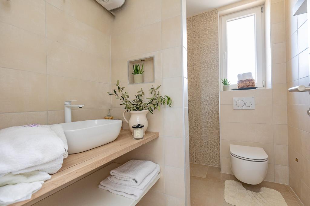 Oferim oaspeților noștri mai mult decât simpla închiriere de cazare - oferim un sentiment de primire, confort și o vacanță lipsită de griji. La sosire, veți fi întâmpinați cu o băutură de bun venit, precum și cu conținutul de bază pentru un început plăcut al sejurului: cafea, ceai, apă și dulciuri. Pentru un confort deplin, oferim un serviciu gratuit de mic dejun în cameră, conform dorințelor dumneavoastră. Pe durata sejurului, este disponibil un serviciu de curățenie, astfel încât să vă puteți relaxa pe deplin și să vă bucurați de vacanță. De asemenea, suntem bucuroși să vă ajutăm să organizați excursii, activități și recomandări locale, iar prin aranjament, oferim și prepararea de pește sau carne la grătar pentru seri mediteraneene relaxante și autentice în intimitatea cazării dumneavoastră. Scopul nostru este ca dumneavoastră să vă simțiți speciali, îngrijiți și relaxați alături de noi - din primul moment până la plecare.
