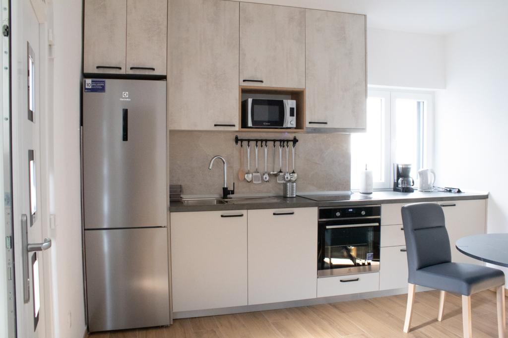Un apartament spațios cu trei camere, cu o terasă, un balcon mare și un loc de parcare privat, ocupă întreg etajul 1 al unei case recent renovate complet pe strada principală din centrul orașului Vodice. Este perfect situat în imediata apropiere a portului ACI, între două plaje mari ale orașului. La 100 de metri puteți găsi piața orașului, piața de pește, magazine, oficiu poștal, bancă, brutărie, farmacie, clinică, cluburi de noapte și multe cafenele și restaurante. Apartamentul este format din două dormitoare cu un pat dublu mare, un dulap glisant, un birou și un smart TV mare, un living dotat cu o canapea extensibilă mare, un dulap și un smart TV mare, o bucătărie complet utilată (frigider cu adâncime). congelator, aragaz cu cuptor, cuptor cu microunde, mașină de spălat vase, aparat de cafea, ceainic) cu sufragerie, baie (chiuvetă, duș, mașină de spălat) și toaletă separată. Toate camerele sunt dotate cu aer condiționat. Terasa interioara (25m2), balcon mare cu vedere la mare si gratar in curte