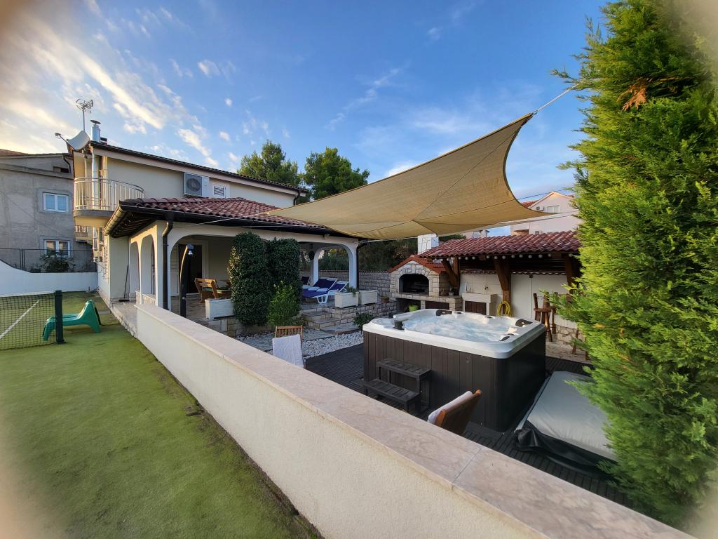 Toată casa doar pentru tine! Paradis pentru familii! Bun venit la Villa Melosa! Casă de vacanță confortabilă în Vodice, cu un teren de tenis privat. Casa poate găzdui până la 10 persoane. Dispune de 5 dormitoare, 3 bai, o bucatarie, un living si o terasa spatioasa unde va puteti relaxa si savurati gratare si un jacuzzi in aer liber pentru 5 persoane. Casa este dotata cu aer conditionat. Proprietatea dispune de 3 locuri de parcare, doua cu garaj acoperit. Întreaga proprietate este împrejmuită, astfel încât să fii sigur că copiii nu vor ieși la drum și se pot juca fără griji în curtea spațioasă.