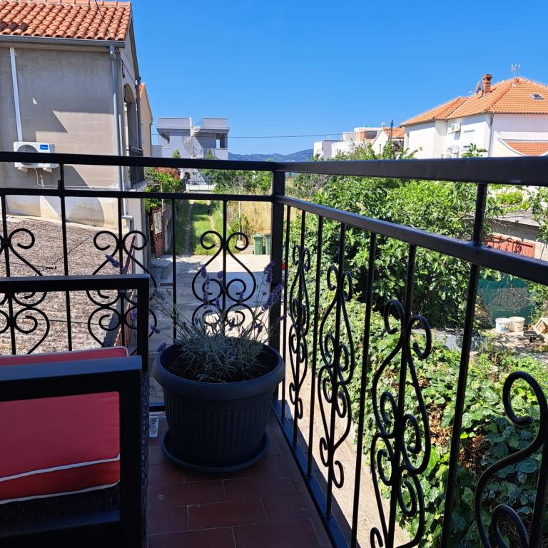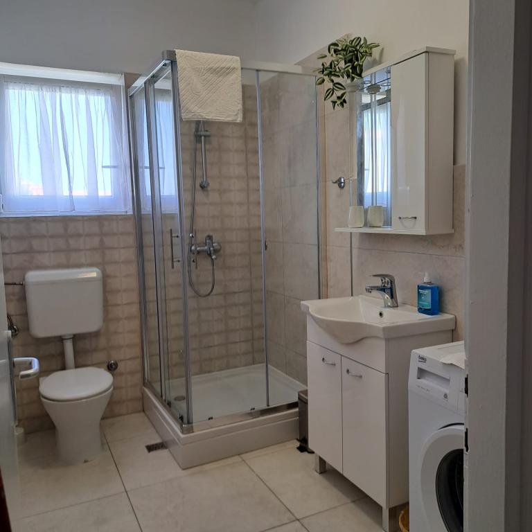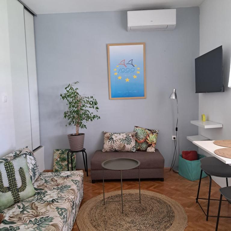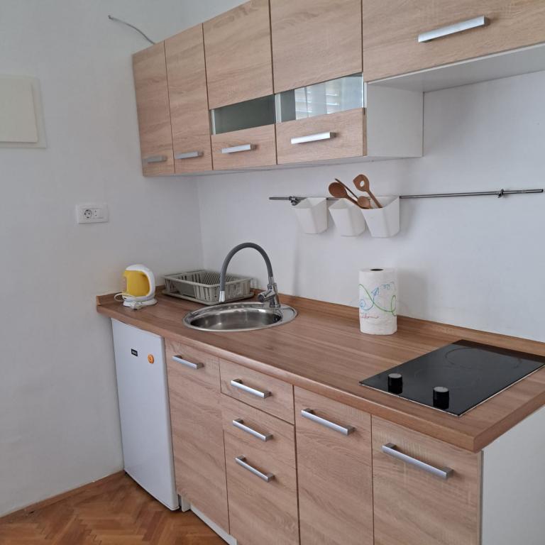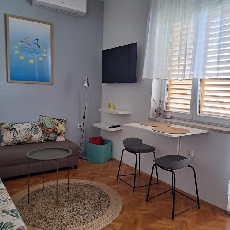 Apartament complet echipat într-o zonă liniștită din Zadar, cu vedere la mare. Clădirea este situată la 300 de metri de mare și la 400 de metri de cea mai apropiată plajă. Centrul este la aproximativ 1 kilometru distanță, iar poteca spre centru poate fi străbătută de o minunată plimbare (Karma și Kolovare) de-a lungul mării. Apartamentul este destinat pentru doua persoane, si este format dintr-un dormitor cu iesire pe balcon, un living spatios cu bucatarie si o baie (dus, masina de spalat...). Există vedere la mare de la balcon.