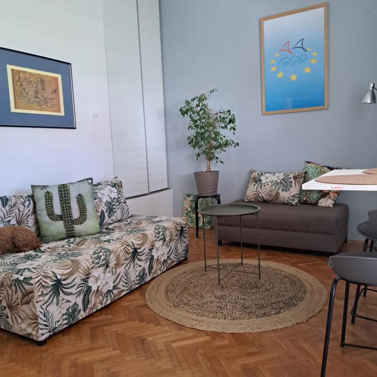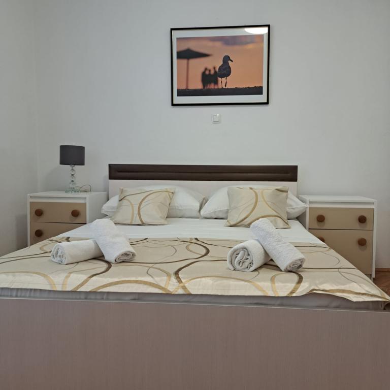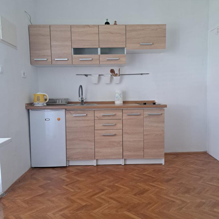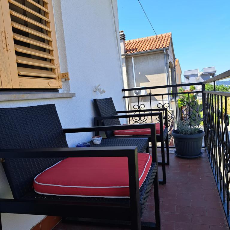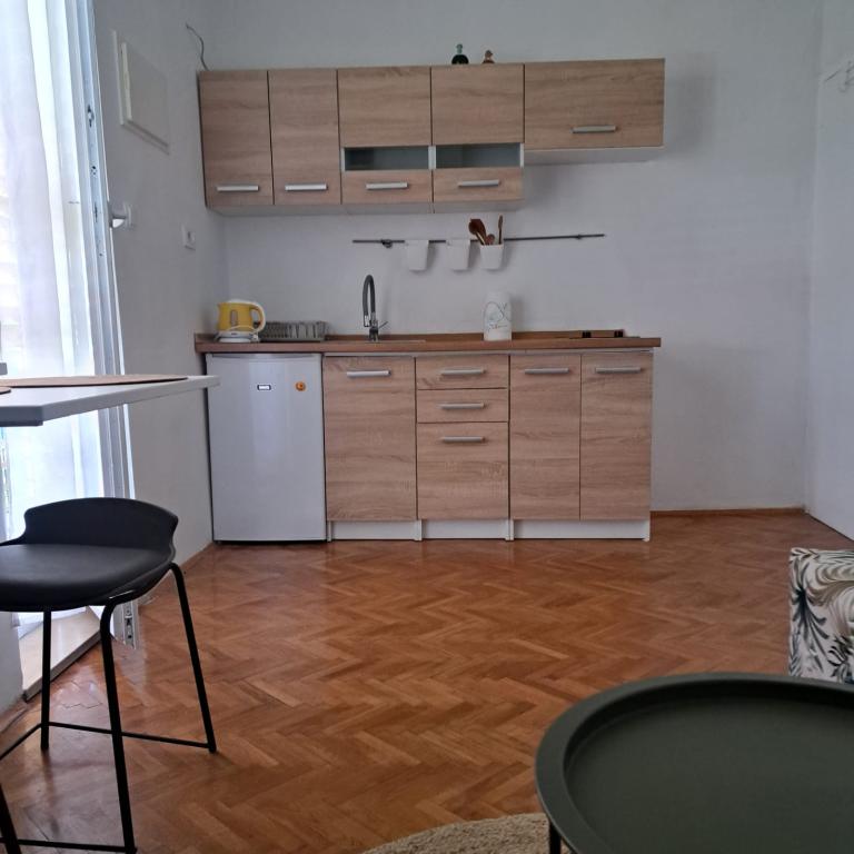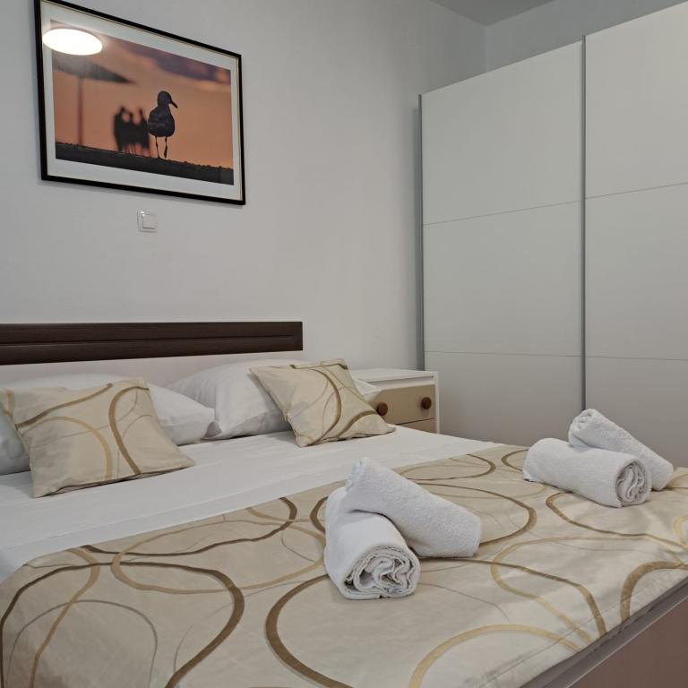 Apartament complet echipat într-o zonă liniștită din Zadar, cu vedere la mare. Clădirea este situată la 300 de metri de mare și la 400 de metri de cea mai apropiată plajă. Centrul este la aproximativ 1 kilometru distanță, iar poteca spre centru poate fi străbătută de o minunată plimbare (Karma și Kolovare) de-a lungul mării. Apartamentul este destinat pentru doua persoane, si este format dintr-un dormitor cu iesire pe balcon, un living spatios cu bucatarie si o baie (dus, masina de spalat...). Există vedere la mare de la balcon.