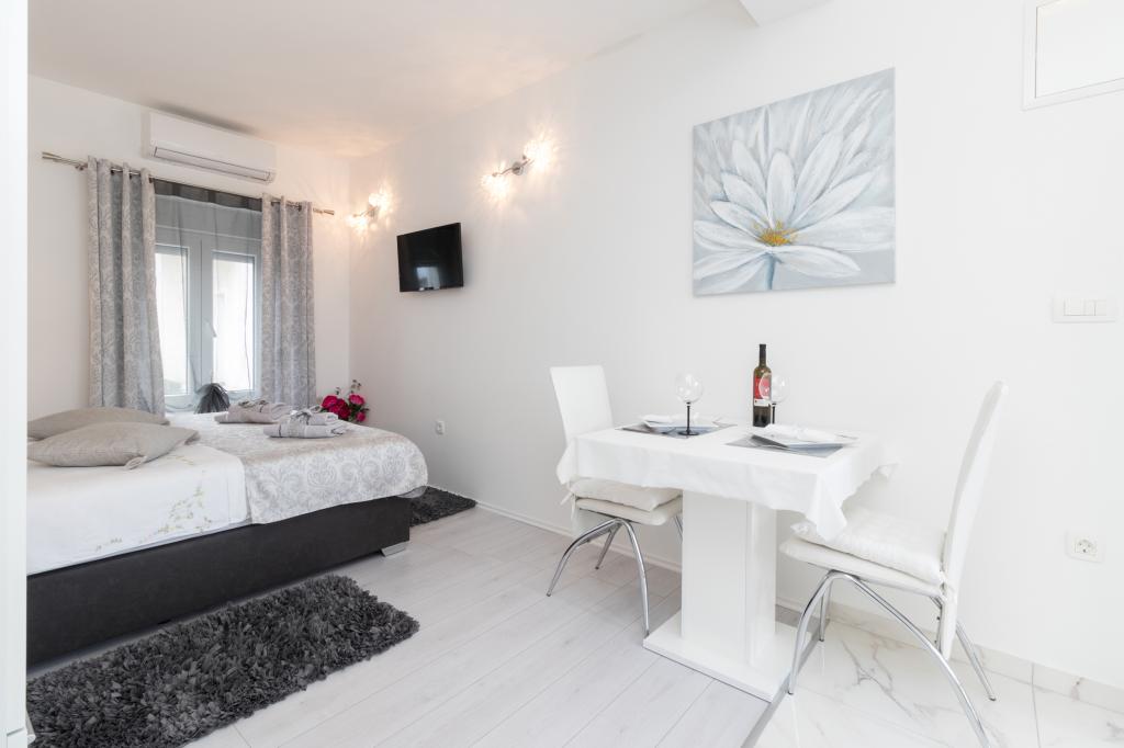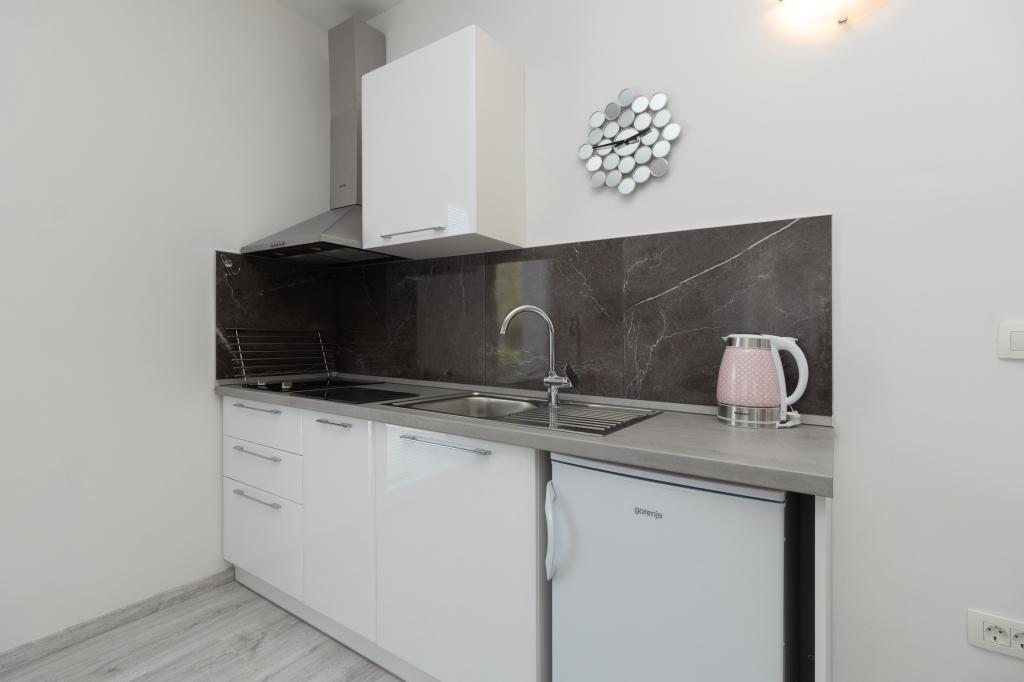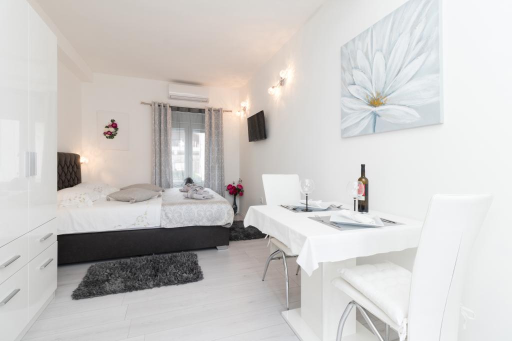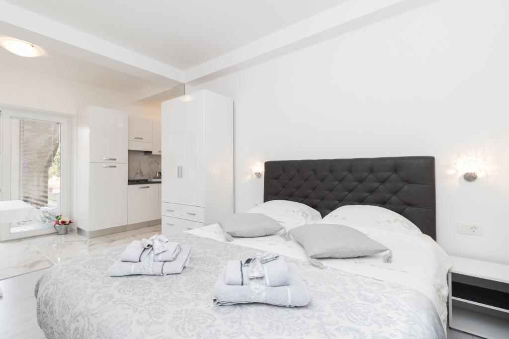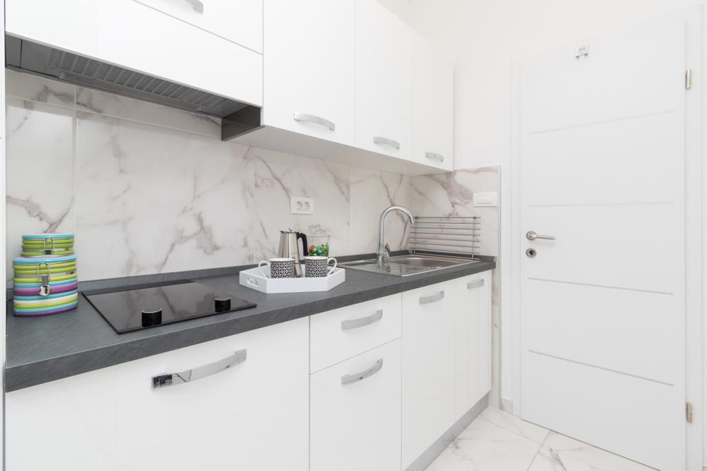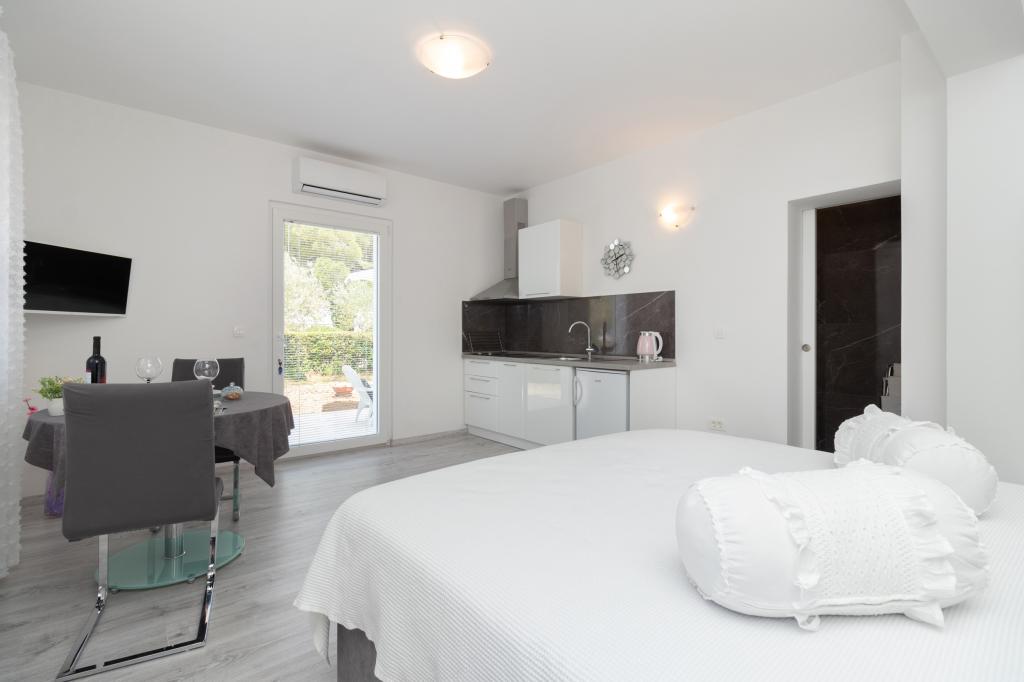 Apartamentele modern echipate sunt situate într-un mediu liniștit, cu o grădină amenajată, ideală pentru relaxare și petrecerea timpului în aer liber. Proprietatea oferă combinația perfectă de confort și funcționalitate, iar fiecare apartament a fost decorat cu grijă pentru a asigura oaspeților o ședere plăcută. Locația este extrem de practică, gara se află la doar 10 minute de mers pe jos, iar aeroportul la 15 minute de mers cu mașina, ceea ce permite sosirea și plecarea ușoară. Dacă sosiți cu mașina, există posibilitatea de a parca în siguranță în cadrul proprietății. Toate facilitățile necesare, cum ar fi magazine, restaurante și cafenele, sunt în apropiere, în timp ce plaja cu pietriș se află la doar 7 minute de mers pe jos.