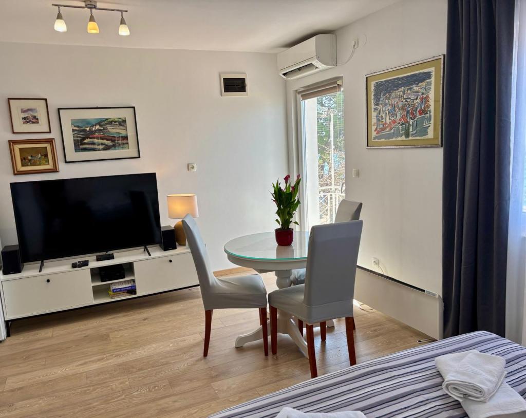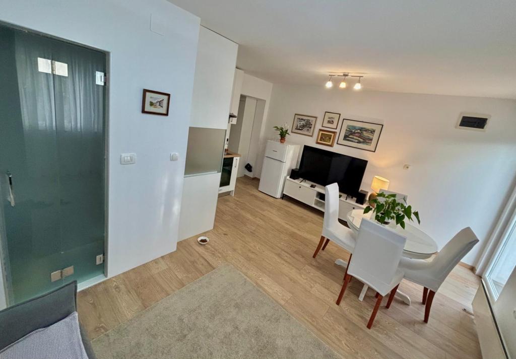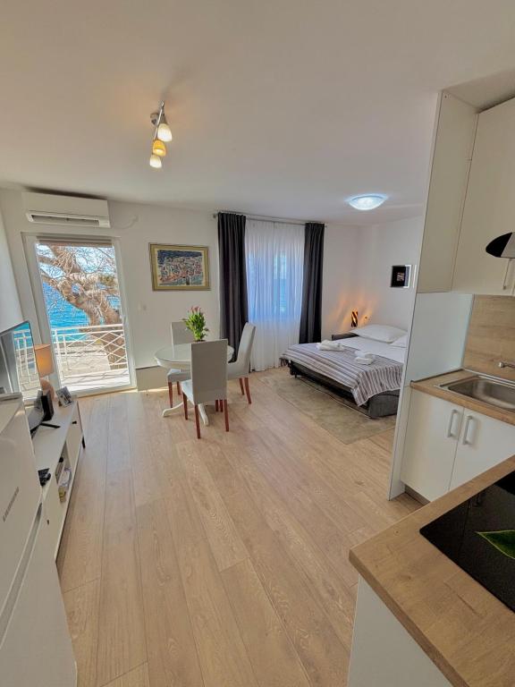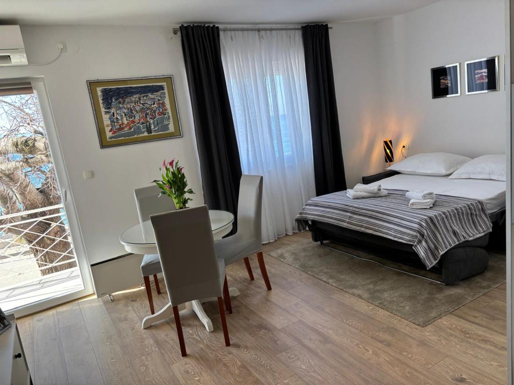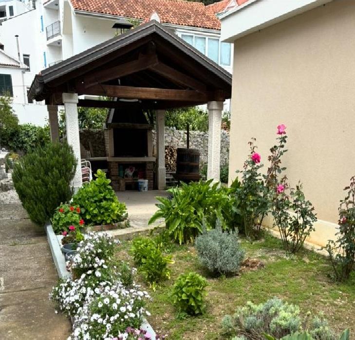 Garsoniera este complet și modern utilată, situată la primul etaj al unei case de familie, aflată la 30 m de mare și de o frumoasă plajă cu pietriș, cu intrare lină în mare. Există o parcare pentru o mașină în fața casei, iar în curte există un foișor cu grătar și mese pentru stat la umbră. În apropiere se află magazine, restaurante, o cofetărie, iar la intrarea în oraș se află centrul comercial Plodine.