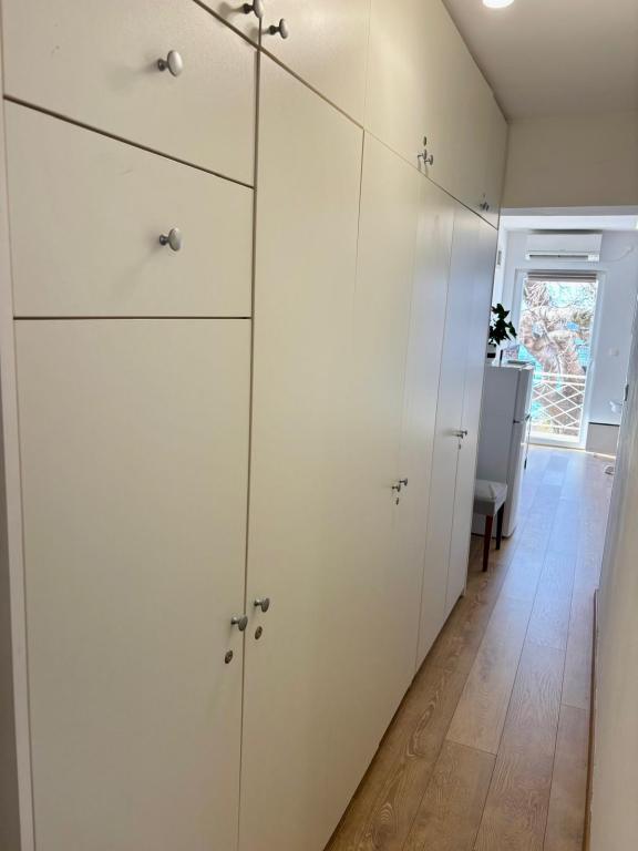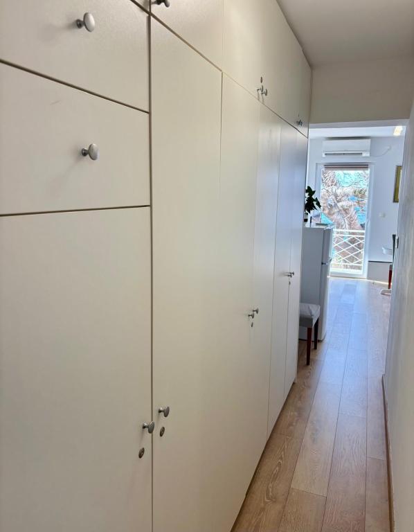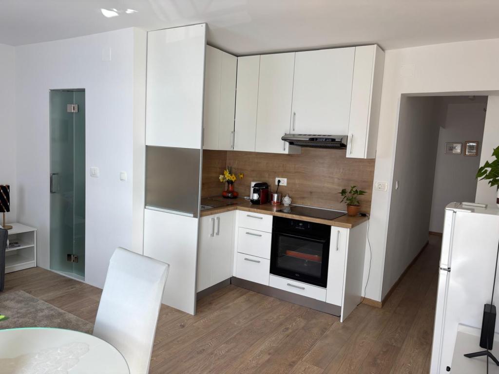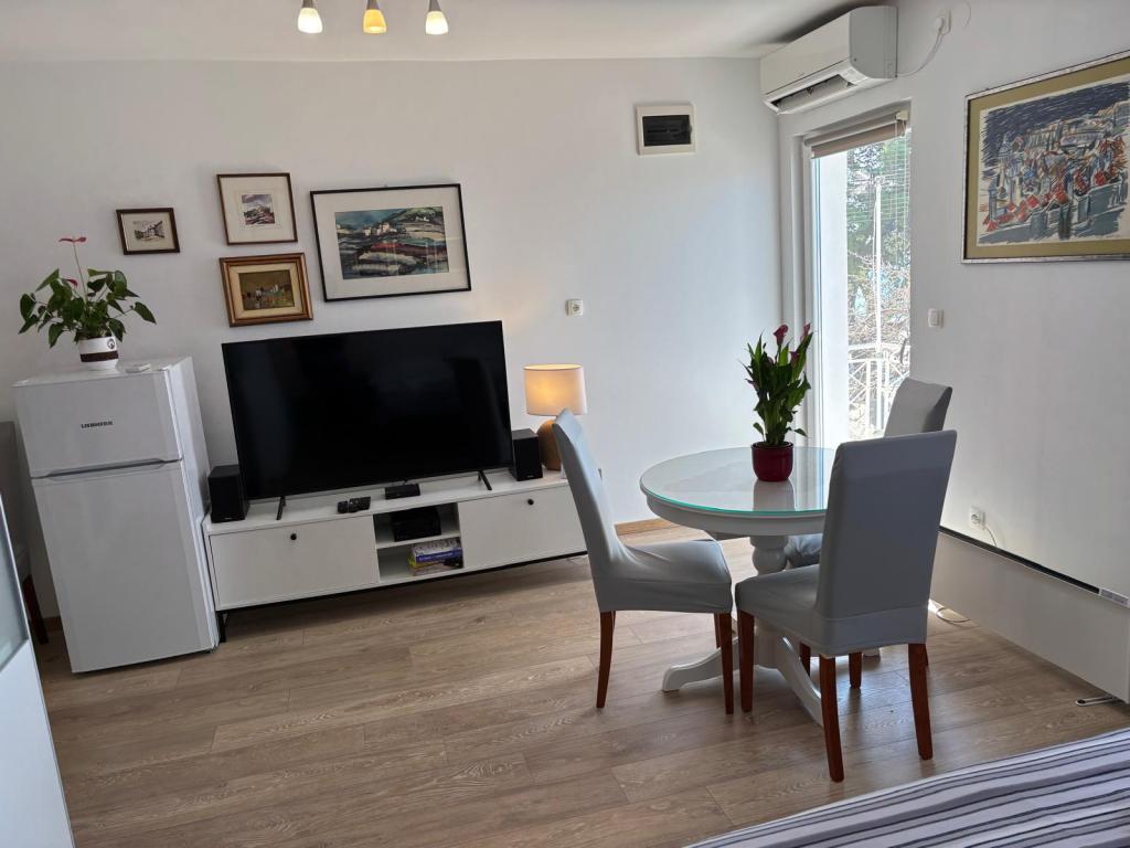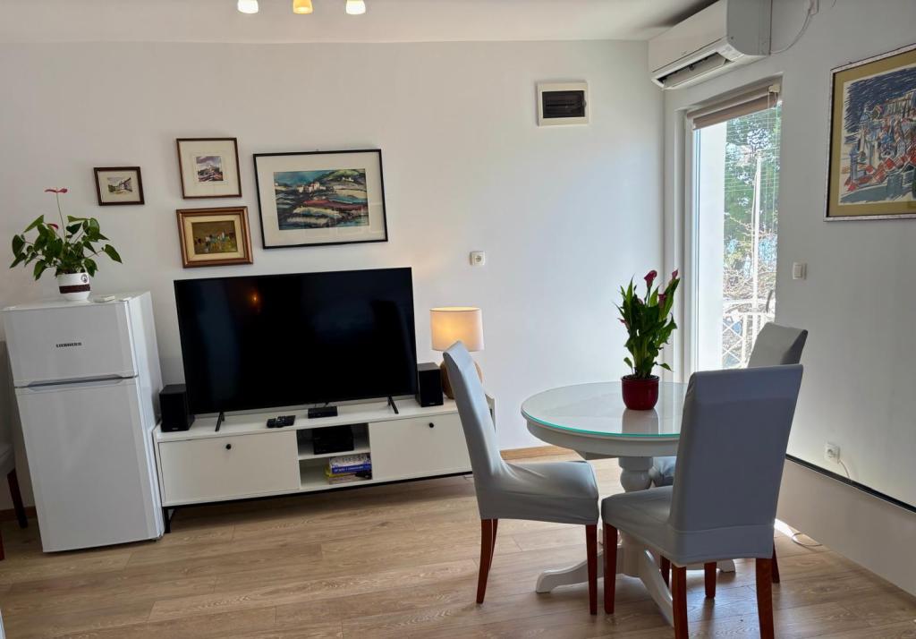 Garsoniera este complet și modern utilată, situată la primul etaj al unei case de familie, aflată la 30 m de mare și de o frumoasă plajă cu pietriș, cu intrare lină în mare. Există o parcare pentru o mașină în fața casei, iar în curte există un foișor cu grătar și mese pentru stat la umbră. În apropiere se află magazine, restaurante, o cofetărie, iar la intrarea în oraș se află centrul comercial Plodine.