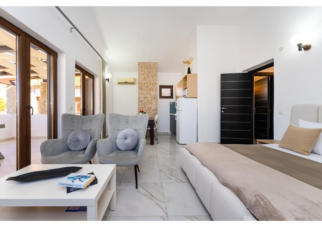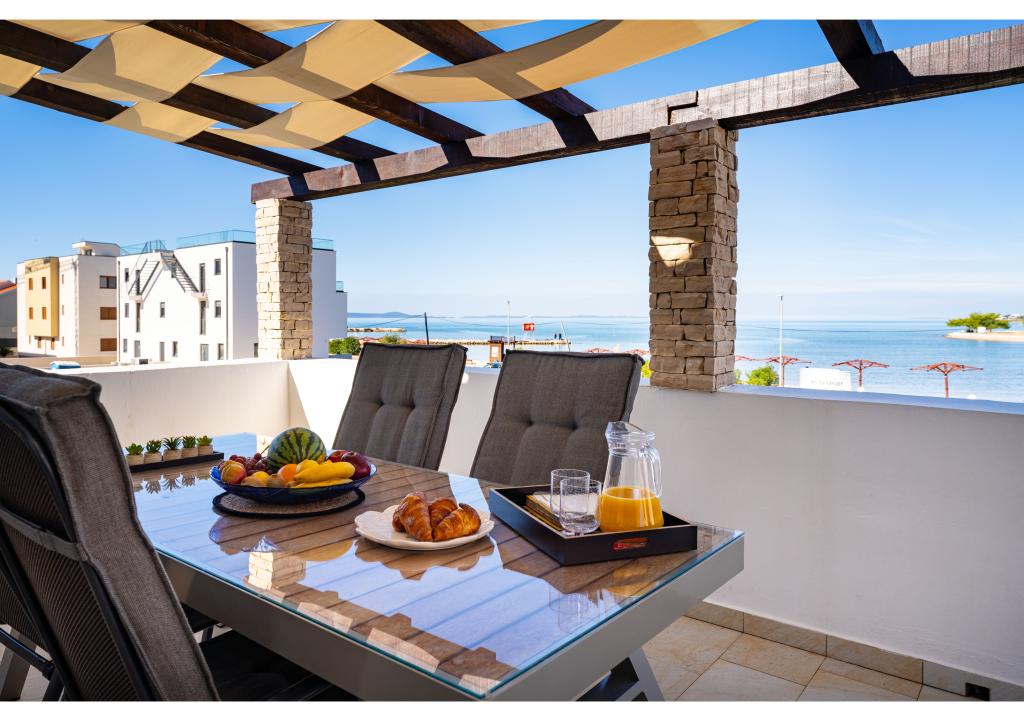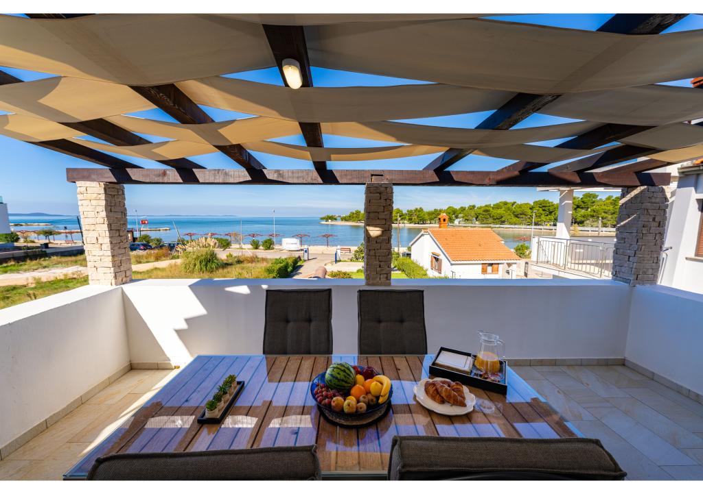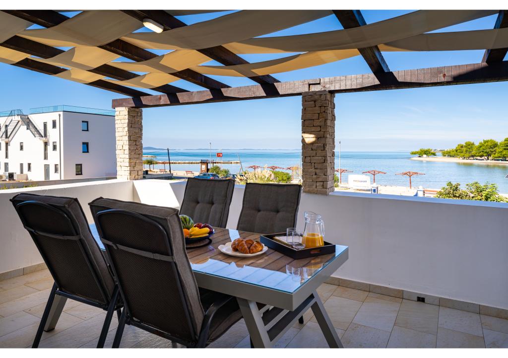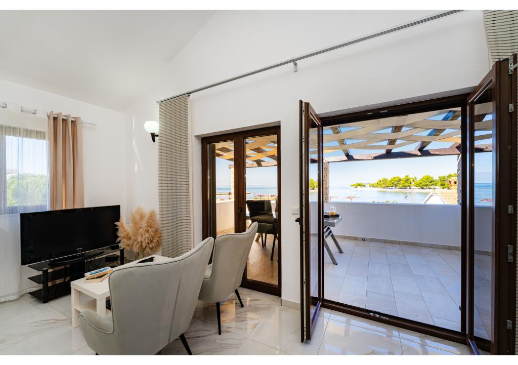 Apartamente primul rând la mare. Terasa cu vedere la mare. Golful este nisipos și puțin adânc. Apartamentele sunt in apropierea centrului turistic Zaton si sunt dotate cu aer conditionat, internet, TV satelit, parcare, gratar etc.