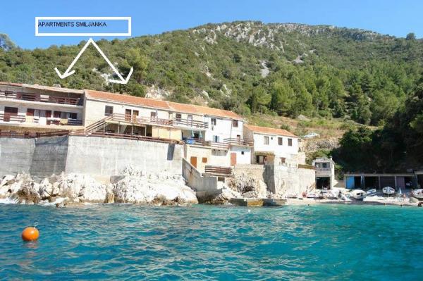 Robinson Smiljanka apartamente sunt situate în golful, respingând o parte retras de pe insula. Casă veche pescar de renovat pentru turism și oferă o vacanță ideală romantic pentru cei care doresc să scape de viața de zi cu zi ocupat. Accesul rutier ului (ultimul 3 km drum pietruit). Parcare și parcare gratar. Distanța de la Gdinj 20 min. de la plajă 20 m. Deși izolat și departe de civilizație solid și pur și simplu echipat pentru viața de zi cu zi. Panouri solare asigura iluminatul de încărcare acasă și telefonul mobil. Apa din rezervoare apa de ploaie. Apa rece a fost instalat în bucătărie și baie. In afara de dus încălzit de soare. Frigider și aragaz. Va oferim două apartamente: 1 APP (6 persoane) Cu două etaje, intrare separata in aer liber, cu vedere la mare. 2 dormitoare, baie, balcon, bucatarie, baie, terasa cu scaune în aer liber. 2 APP (8 persoane): pe două etaje, intrare separata in aer liber, cu vedere la mare. 3 dormitoare, 2 bai, balcon, bucatarie, terasa cu scaune în aer liber. Bun venit
