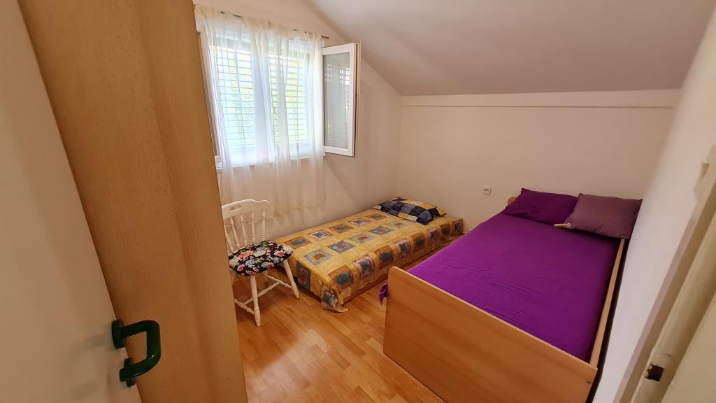 Casa este formată din două apartamente complet utilate (parter și etaj) cu o capacitate totală de 8 persoane. Apartamentele sunt separate, iar casa este închiriată în întregime - o soluție ideală pentru două familii sau un grup de prieteni care doresc să petreacă vacanța împreună, menținând în același timp intimitatea. Fiecare apartament are un living, bucătărie, baie, 2 dormitoare și o terasă proprie acoperită - locul perfect pentru cafeaua de dimineață, prânzul la umbră sau socializarea seara. Casa dispune de parcare gratuită (maxim 3 mașini), Wi-Fi, aer condiționat și televizor în ambele apartamente. Locația este excelentă pentru excursii la Šibenik (12 km), Vodice (10 km) și parcurile naționale din apropiere, Krka și Kornati. În apropiere se află un magazin, un restaurant și o plajă bine întreținută, cu mare limpede.