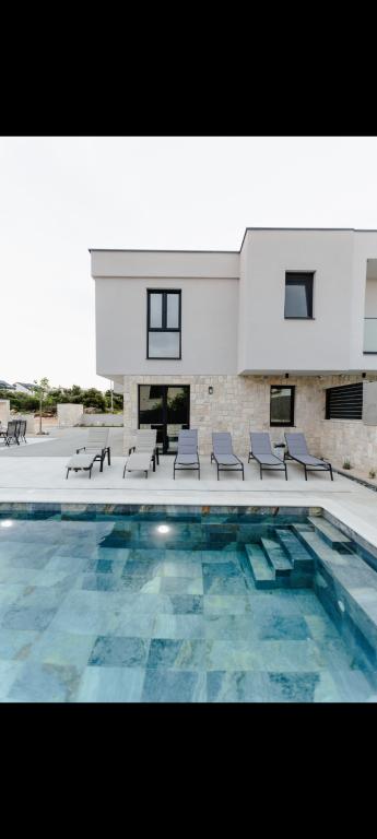 Vila de lux Pam este situată în Mandre, la doar 400 de metri de prima plajă cu pietriș. Dispune de cazare cu aer condiționat în fiecare cameră și o piscină privată încălzită (8x3,5) cu o capacitate de până la max. 8 persoane. Această vilă de 230 m2 este nou construită și oferă acces la un balcon, parcare privată gratuită, WiFi gratuit și o curte de 300 m2. Vila spațioasă are 4 dormitoare, 4 băi, un TV cu ecran plat și o sufragerie, o bucătărie complet utilată și o terasă de vară cu vedere la piscină. De asemenea, oferim un grătar în aer liber pentru mese de neuitat și socializare la aer curat. Această vilă de lux este ideală pentru o vacanță relaxantă cu familia și prietenii.