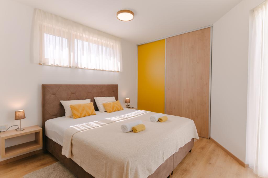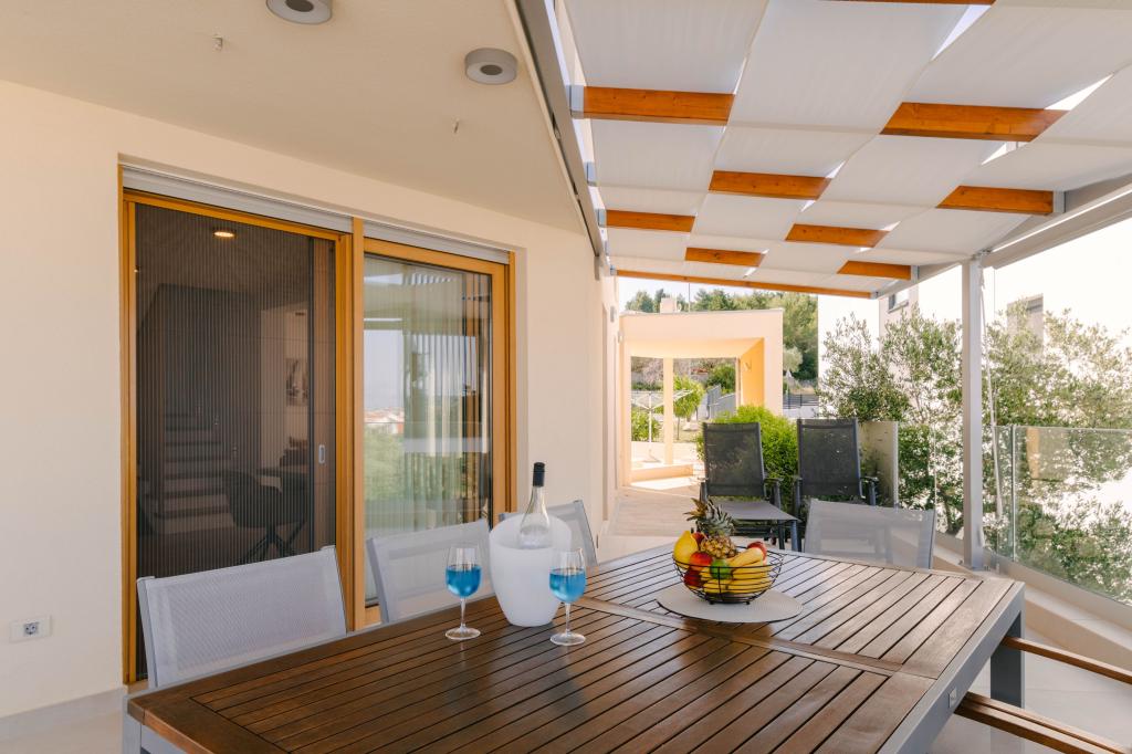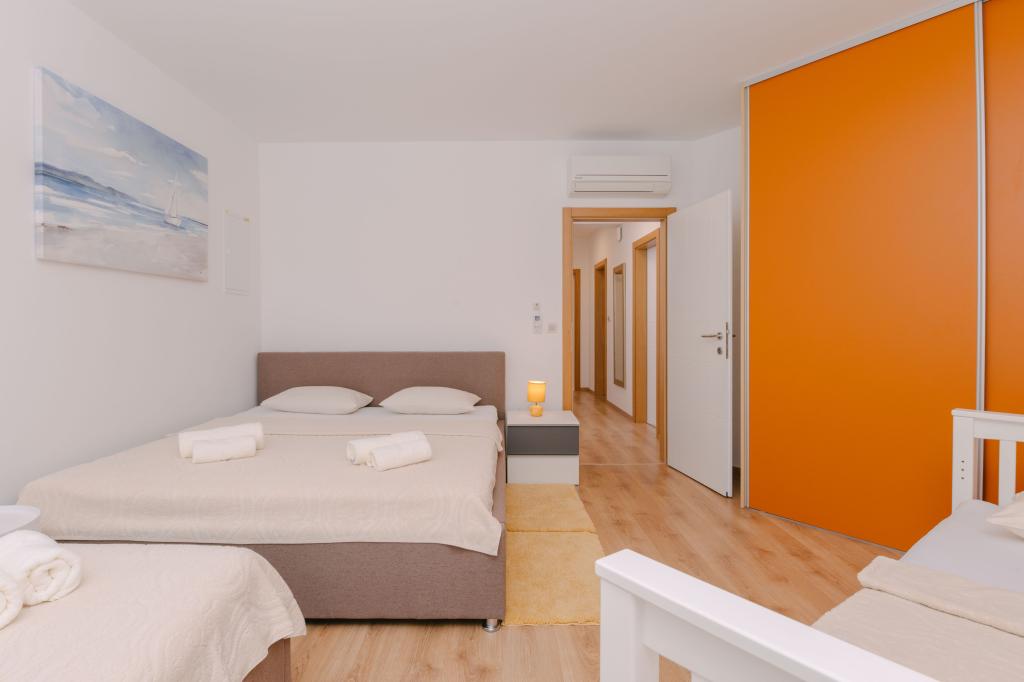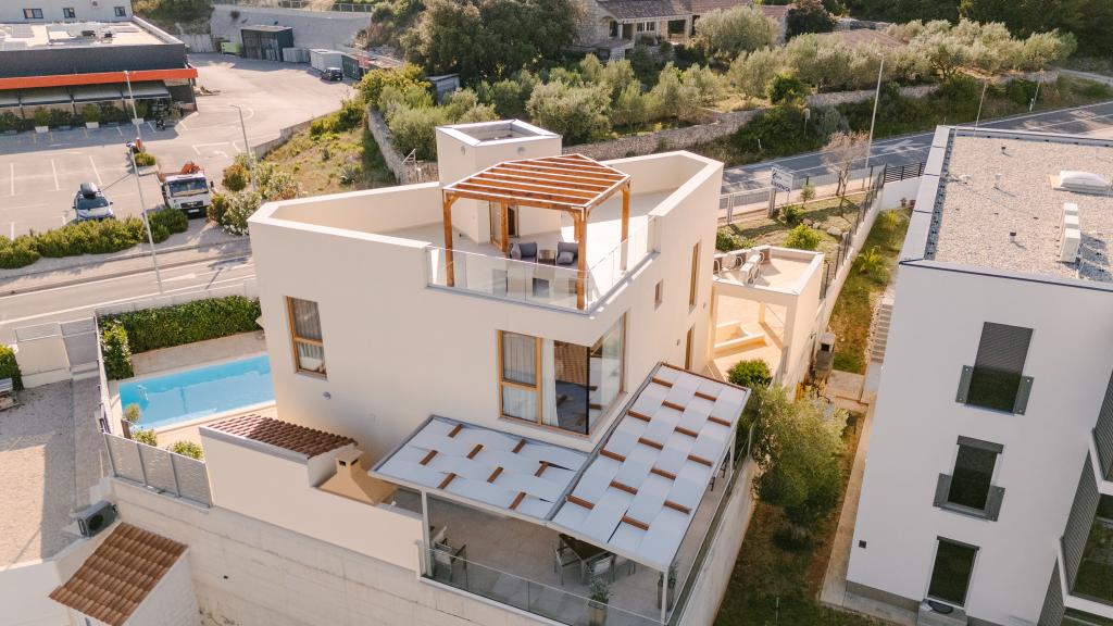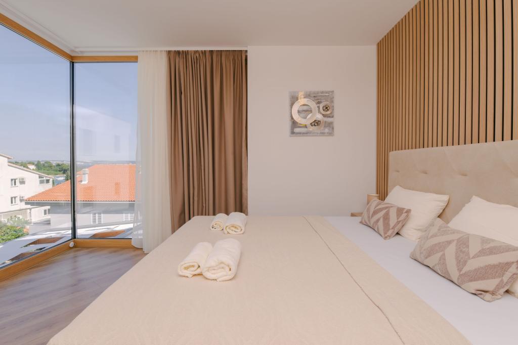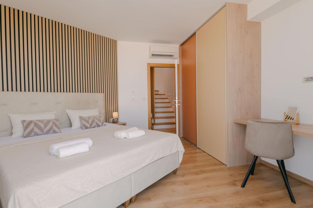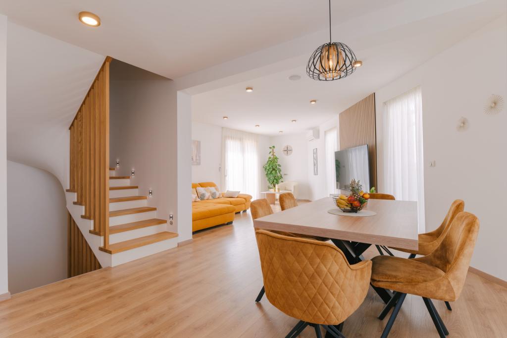 Trei dormitoare matrimoniale moderne sunt situate la etaj, în timp ce o cameră de oaspeți este situată la subsol. Toate băile sunt dotate cu accesorii Grohe și Laufen de ultimă generație, gresie ceramică de design prestigios și uși elegante din sticlă. Casa este clasificată oficial de Ministerul Turismului din Republica Croația, ceea ce permite cazare confortabilă pentru 9, chiar 10 oaspeți. Livingul și sufrageria open space, precum și fiecare dormitor, sunt dotate cu aparate de aer condiționat individuale cu mod silențios, perfecte pentru un somn liniștit. Bucătăria modernă, de la celebrul brand austriac DanKüchen, este complet utilată cu electrocasnice de ultimă generație, inclusiv un frigider cu aparat de gheață și un dozator de apă rece.