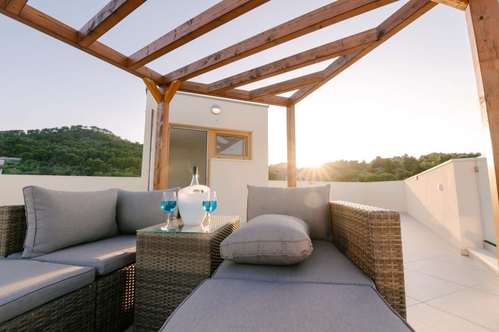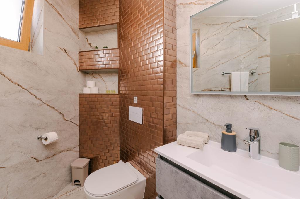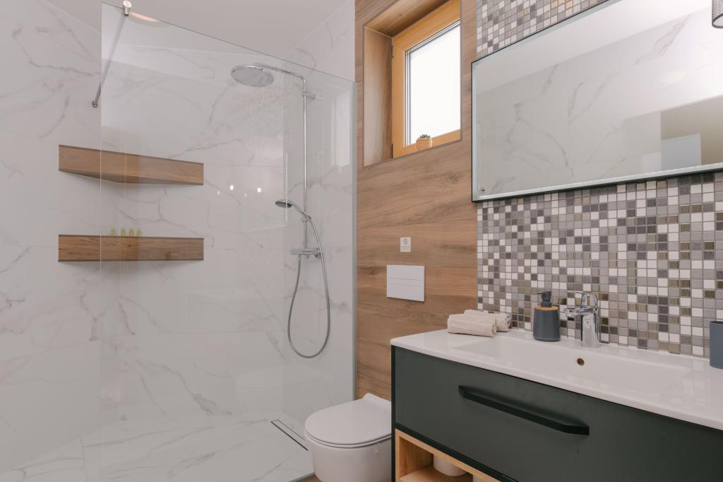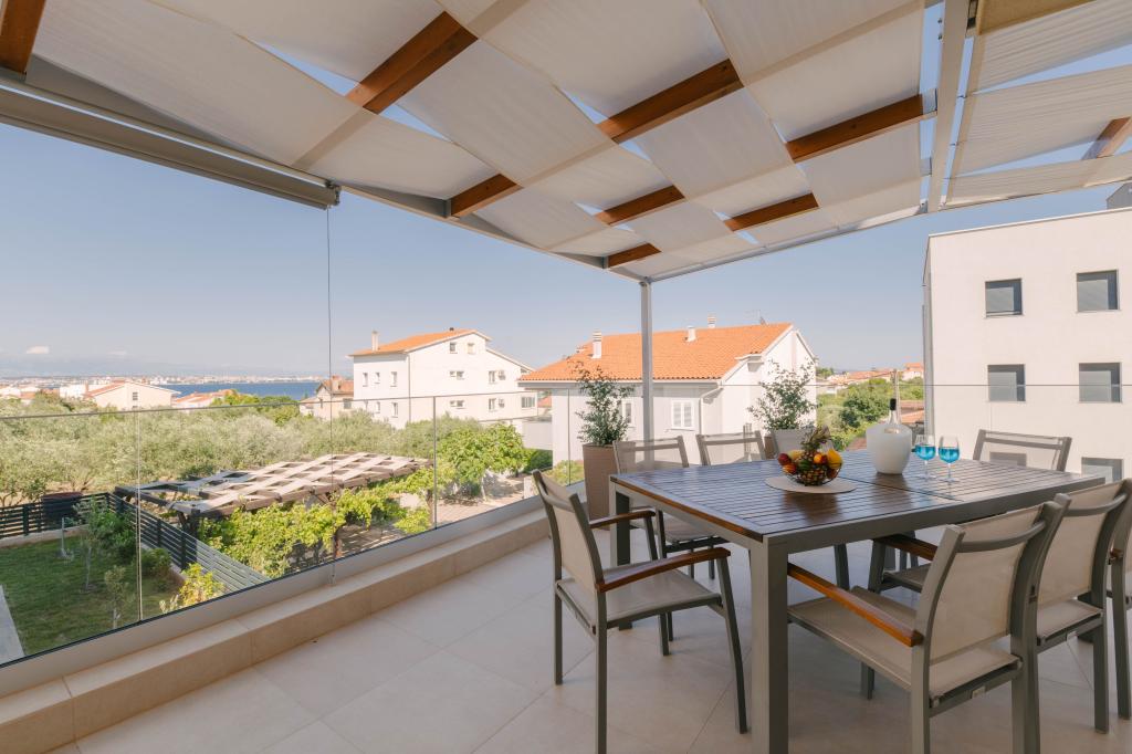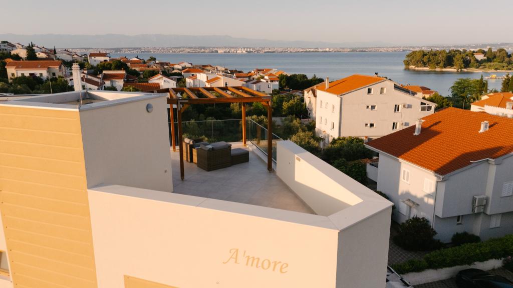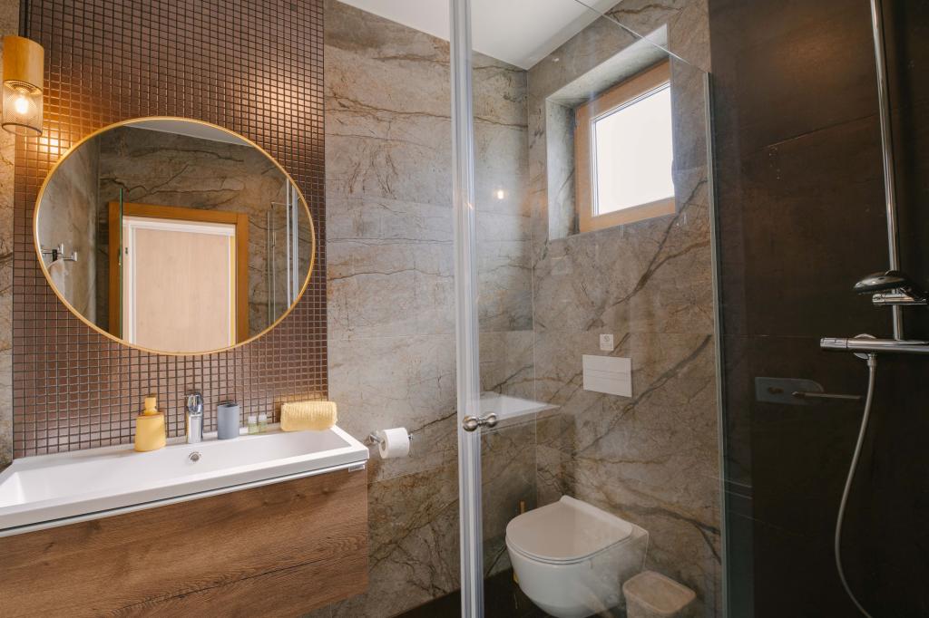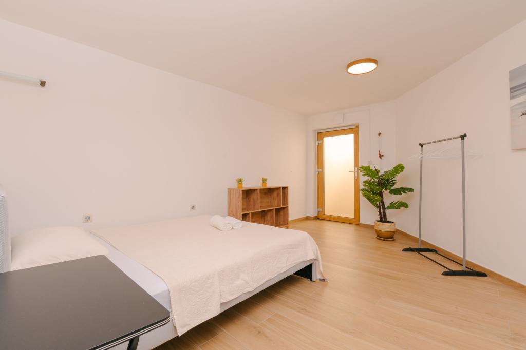 Trei dormitoare matrimoniale moderne sunt situate la etaj, în timp ce o cameră de oaspeți este situată la subsol. Toate băile sunt dotate cu accesorii Grohe și Laufen de ultimă generație, gresie ceramică de design prestigios și uși elegante din sticlă. Casa este clasificată oficial de Ministerul Turismului din Republica Croația, ceea ce permite cazare confortabilă pentru 9, chiar 10 oaspeți. Livingul și sufrageria open space, precum și fiecare dormitor, sunt dotate cu aparate de aer condiționat individuale cu mod silențios, perfecte pentru un somn liniștit. Bucătăria modernă, de la celebrul brand austriac DanKüchen, este complet utilată cu electrocasnice de ultimă generație, inclusiv un frigider cu aparat de gheață și un dozator de apă rece.