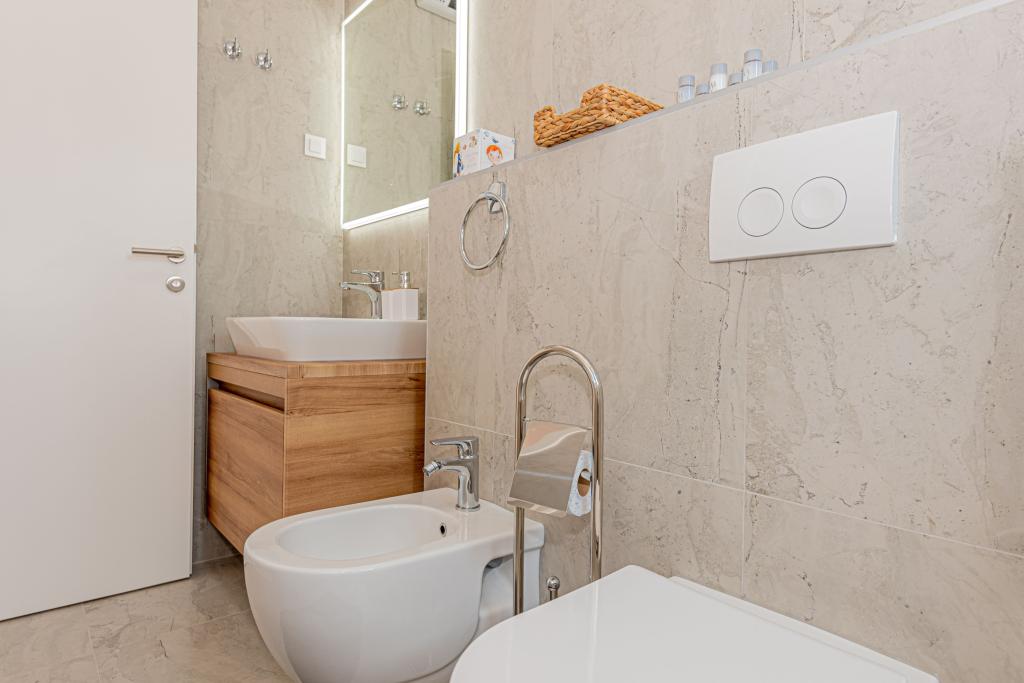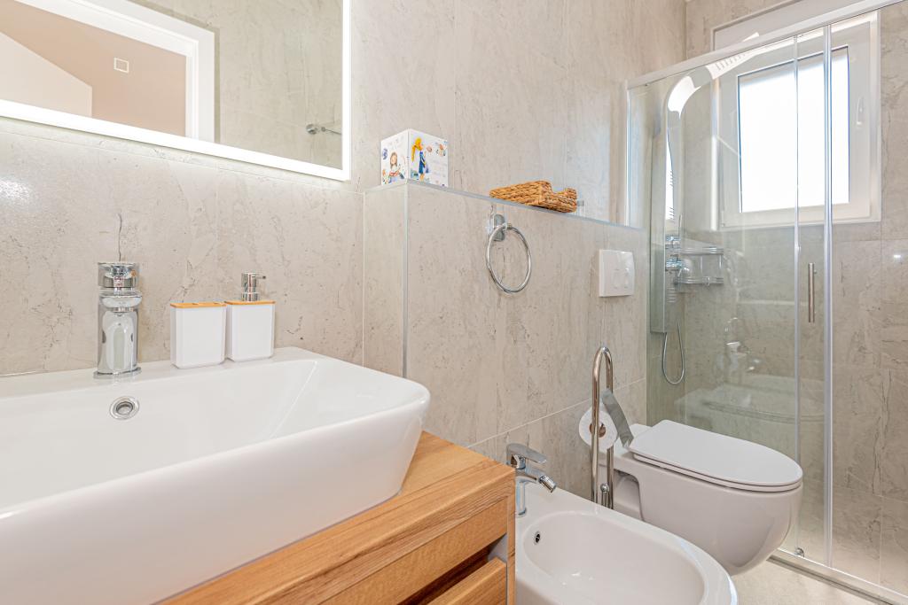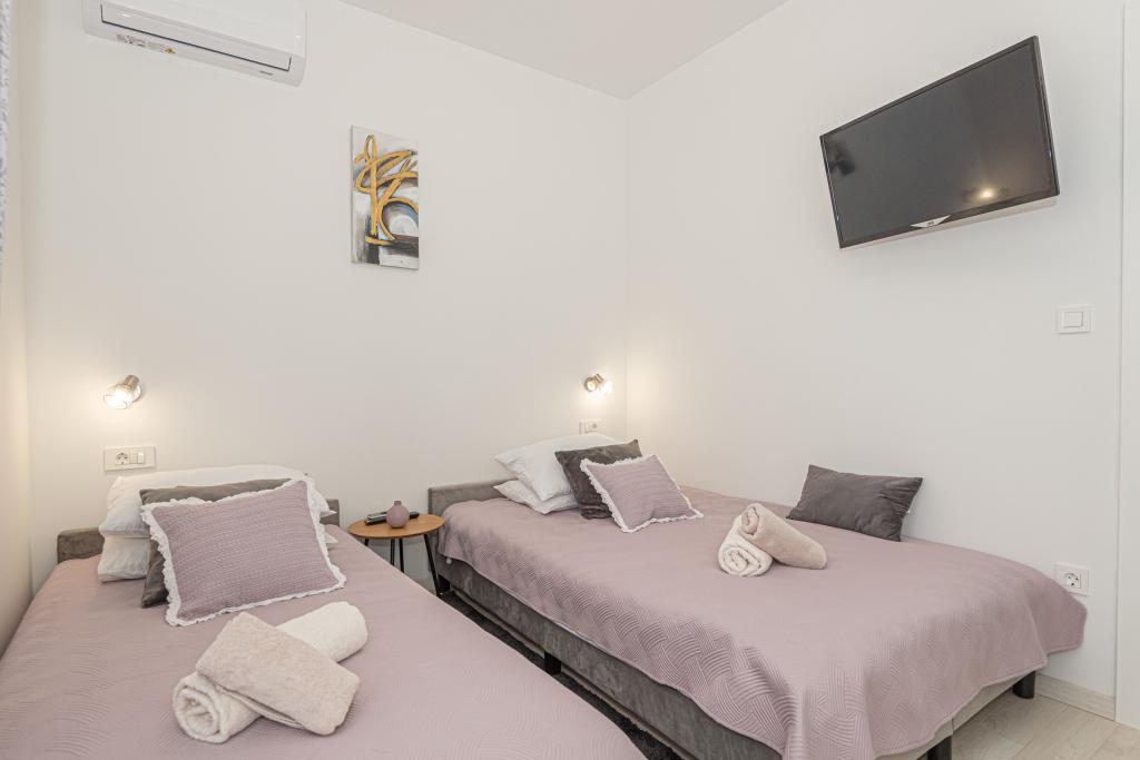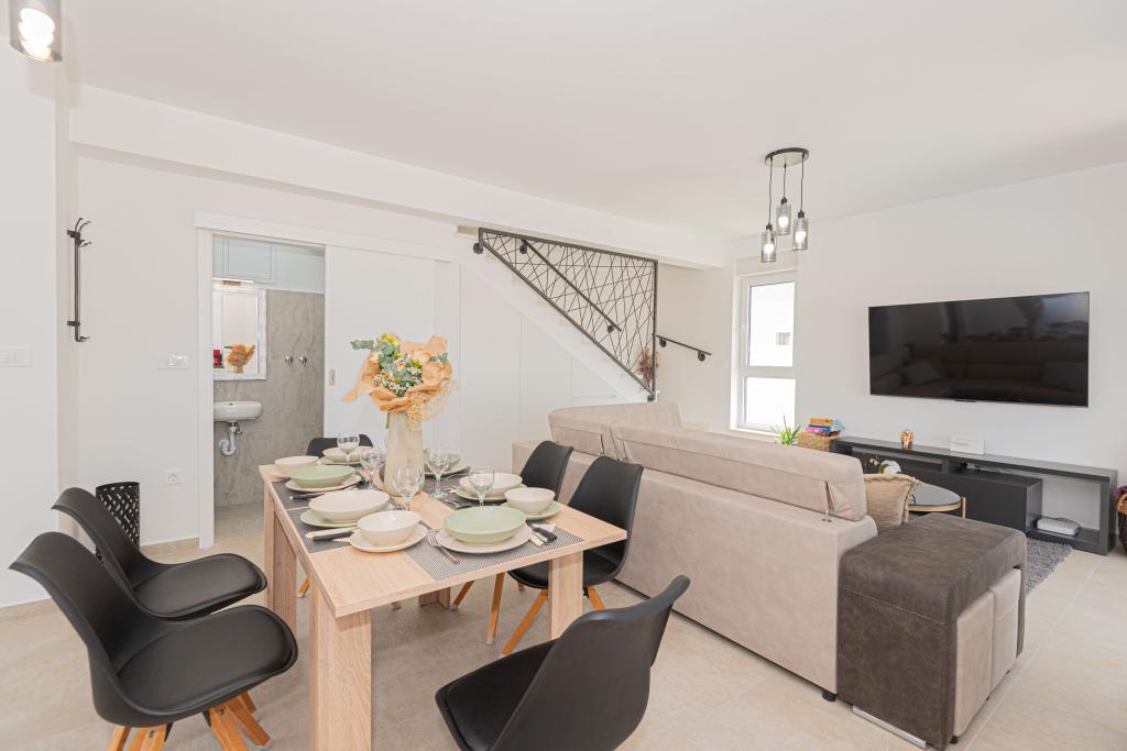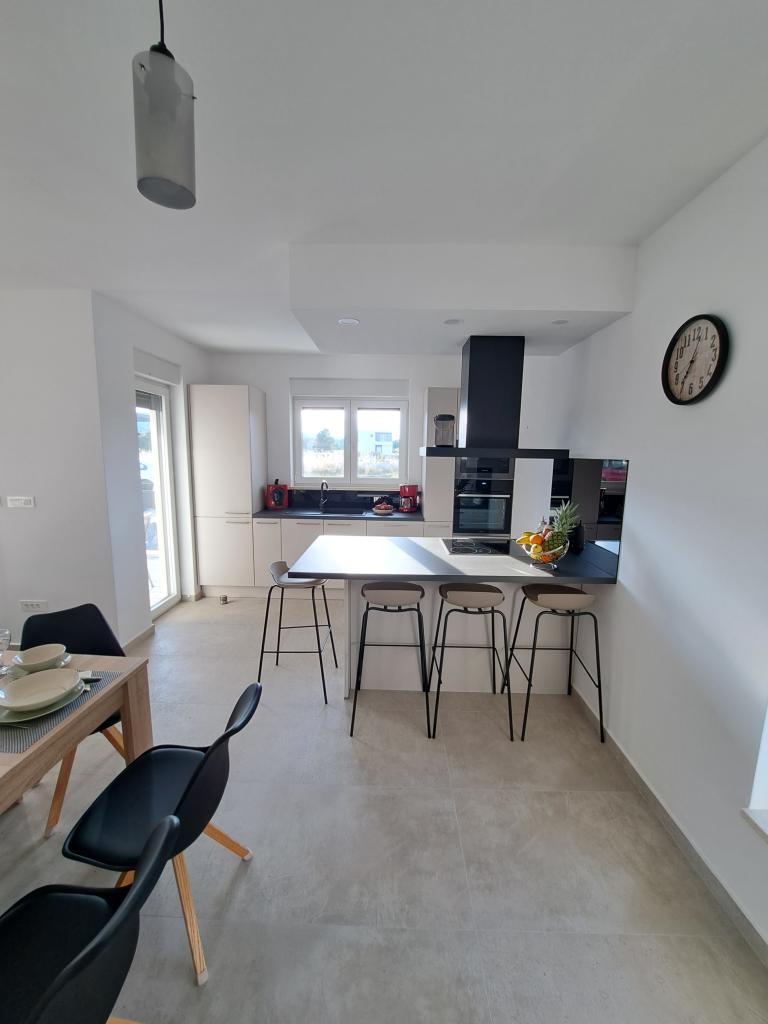 O vilă nouă, complet mobilată, cu piscină, într-un colț liniștit al orașului Vodice, la aproximativ 1 km sau la 15 minute de mers pe jos de centru, plajă și alte facilități. Vila dispune de piscina de 7x3 m, adancime de 1,5 m, incalzita, langa piscina se afla sezlonguri, leagan de gradina si mobilier pentru odihna in foisor. În curtea din spate există un grătar în aer liber și o masă. Casa are trei camere la primul etaj, un dormitor matrimonial cu o baie si doua camere cu o baie pe coridorul comun. Paturile din doua camere au dimensiunile de 180x200 cm, iar a treia camera are paturi separate, 90x200 si 120x200. Toate camerele sunt dotate cu televizor si aer conditionat. Lenjeria de pat și prosoapele sunt disponibile pentru oaspeți. La parter, bucătăria este complet utilată cu vase, prăjitor de pâine, mixer și storcator electric pentru citrice, precum și aparat de cafea cu filtru. Bucătăria are mașină de spălat vase, frigider și congelator, cuptor și cuptor cu microunde. Livingul are o canapea pe colț și un televizor cu internet și canale prin satelit.