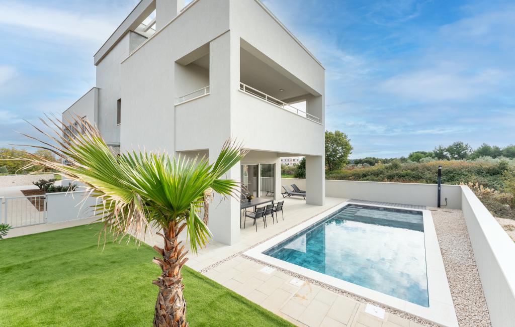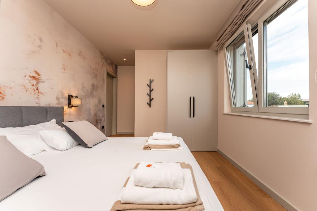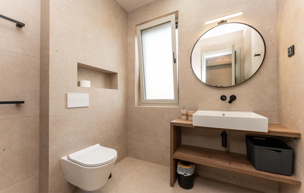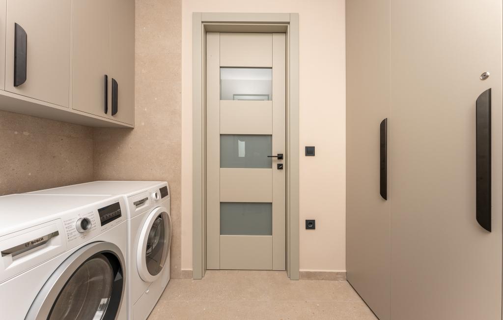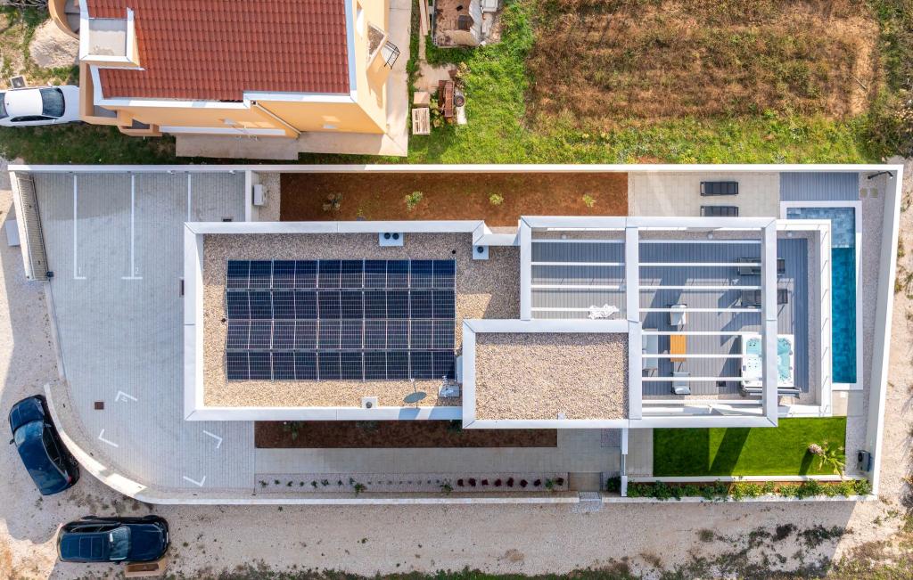 Casa de aproximativ 270 m² este situată în Zaton, la 12 km nord-vest de Zadar. Clădirea este nouă, finalizată în iunie 2025. În curtea împrejmuită există 4 locuri de parcare, 2 stații de încărcare pentru mașini electrice, o piscină încălzită de 30 m² și o terasă mare unde vă puteți bucura de umbră până după-amiaza. Casa are două apartamente, identice ca dispunere, fiecare cu living, bucătărie complet utilată, 3 dormitoare, 2 băi și o toaletă suplimentară. Toate camerele sunt dotate cu aer condiționat și fiecare este dotată cu un televizor inteligent. Casa este proiectată pentru 12 persoane. PS5 este situat în camera copiilor de la fiecare etaj al casei. Pe acoperișul casei există o terasă cu vedere la mare, o chicinetă suplimentară, mobilier de grădină și o cadă cu masaj pentru a vă bucura de timpul zilei și al serii. Vă puteți bucura de facilitatea noastră cu familia și/sau prietenii și puteți fi împreună, dar și separat (fiecare în propriul apartament) atunci când aveți nevoie. În timpul zilei, cu siguranță vă veți bucura de piscină și de umbra oferită de terasa inferioară, în timp ce seara vă veți bucura de acoperiș.